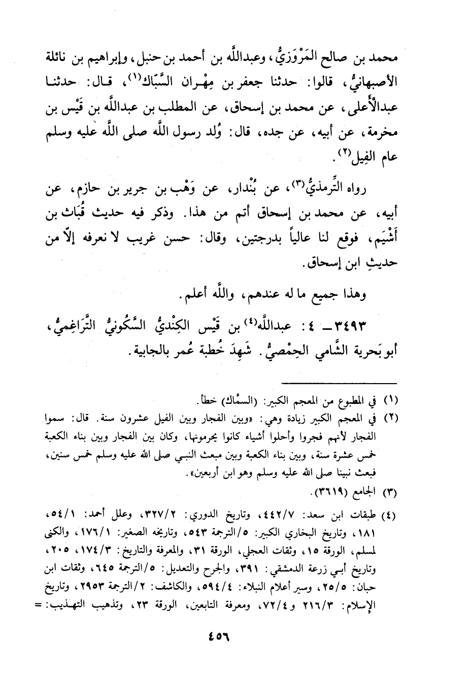 3493 - 4: عَبد اللَّهِ بن قيس الكندي السكوني التراغمي (4) ، أَبُو بحرية الشامي الحمصي. شهد خطبة عُمَر بالجابية.