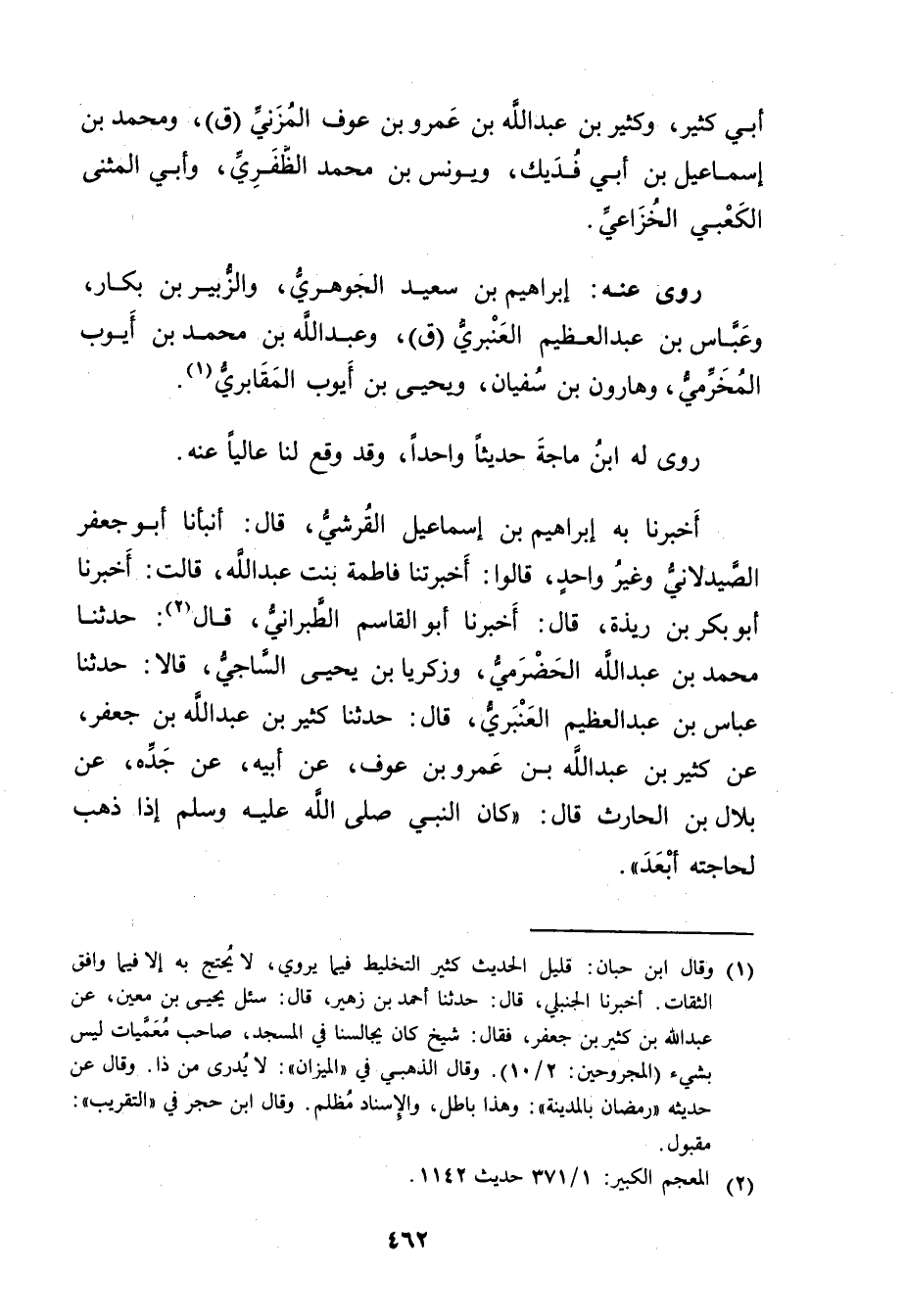 أَخْبَرَنَا بِهِ إِبْرَاهِيمُ بْنُ إِسْمَاعِيلَ الْقُرَشِيُّ، قال: أنبأنا أَبُو جَعْفَرٍ الصَّيْدَلانِيُّ وغَيْرُ واحِدٍ، قَالُوا: أَخْبَرَتْنَا فَاطِمَةُ بِنْتُ عَبد اللَّهِ، قَالَتْ: أخبرنا أَبُو بَكْرِ بْنُ رِيذَةَ، قال: أخبرنا أَبُو الْقَاسِمِ الطَّبَرَانِيُّ، قال (2) : حَدَّثَنَا مُحَمَّدُ بْنُ عَبد اللَّهِ الْحَضْرَمِيُّ، وزَكَرِيَّا بْنُ يَحْيَى الساجي، قَالا: حَدَّثَنَا عباس بن عبد العظيم العنبري، قال: حَدَّثَنَا كَثِيرُ بْنُ عَبد اللَّهِ بْنِ جعفر، عن كثير بن عَبد الله بْن عَمْرو بْن عوف، عَن أَبِيهِ، عَنْ جده، عَنْ بلال بن الْحَارِثِ قال: كَانَ النَّبِيُّ صلى الله عليه وسلم إذا ذهب لحاجته أبعد.