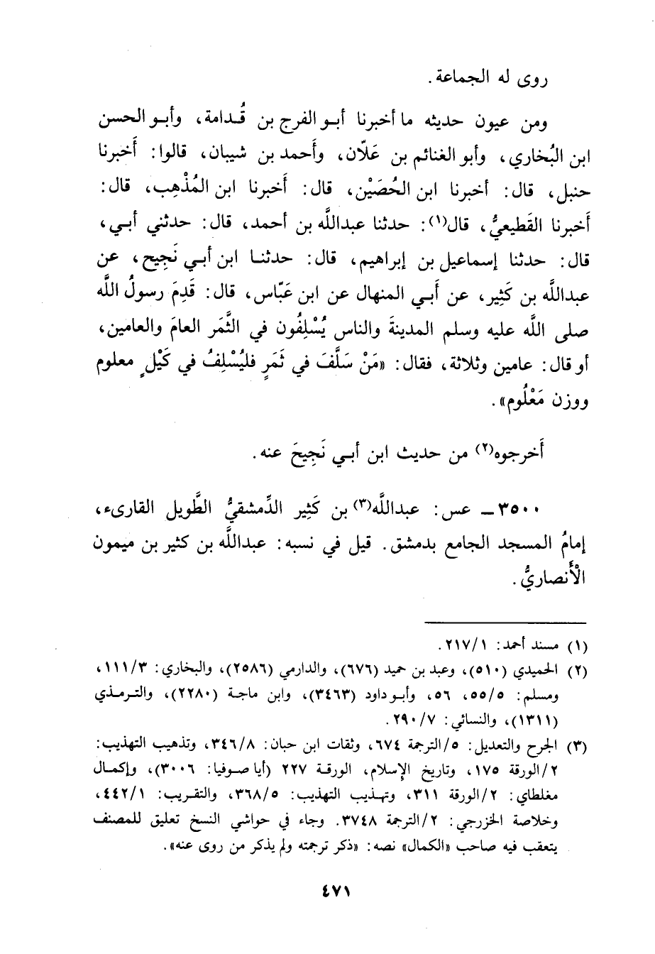 3500 - عس: عَبد اللَّهِ بن كثير الدمشقي الطويل القارئ (3) ، إمام المسجد الجامع بدمشق. قِيلَ فِي نسبه: عَبد اللَّهِ بن كثير بن ميمون الأَنْصارِيّ.