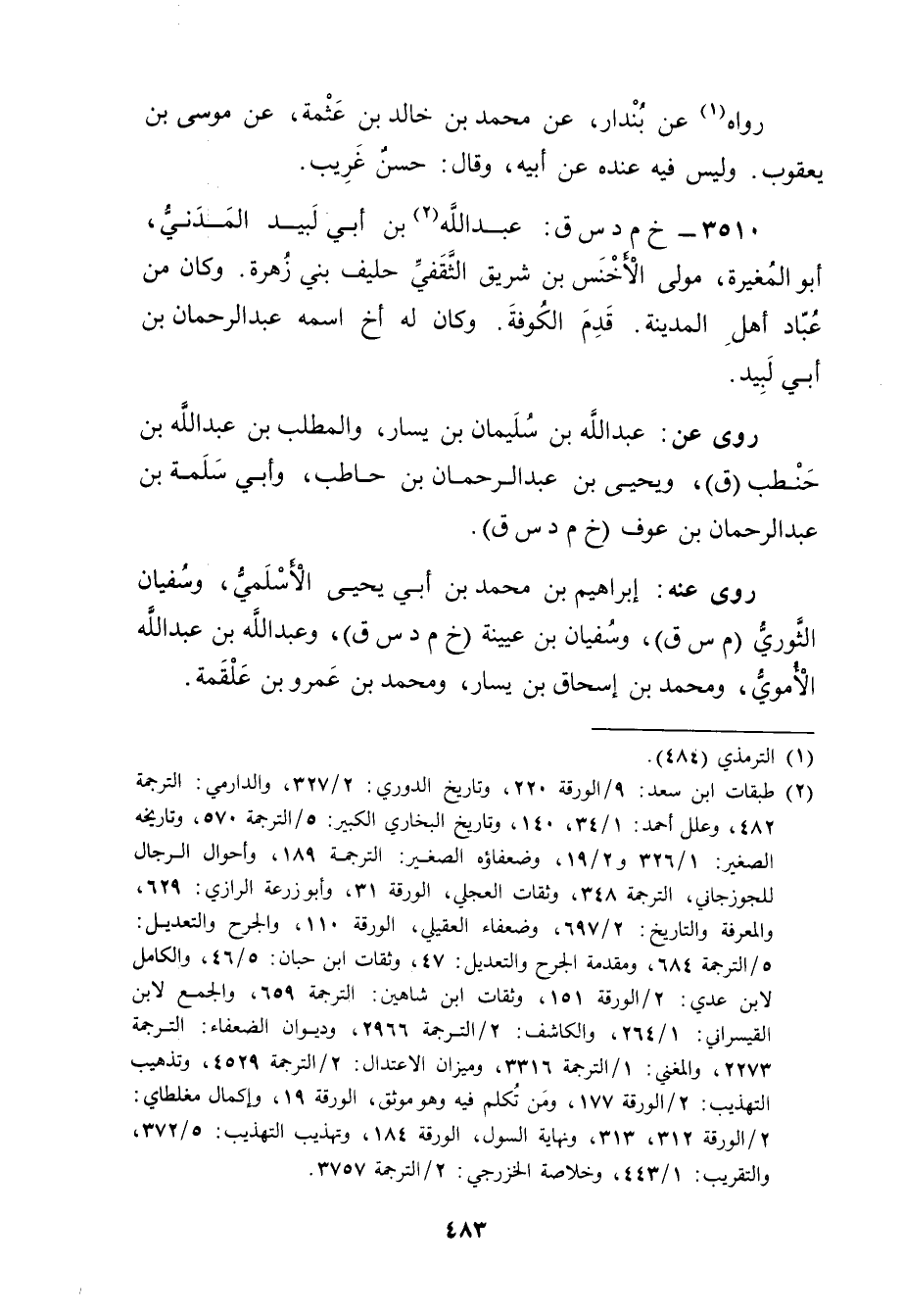 3510 - خ م د س ق: عَبد اللَّهِ بن أَبي لبيد المدبي (2) ، أَبُو المغيرة، مولى الأخنس بن شريق الثقفي حليف بني زهرة. وكان من عباد أهل المدينة. قدم الكوفة. وكان لَهُ أخ اسمه عبد الرحمن بْن أَبي لبيد.
