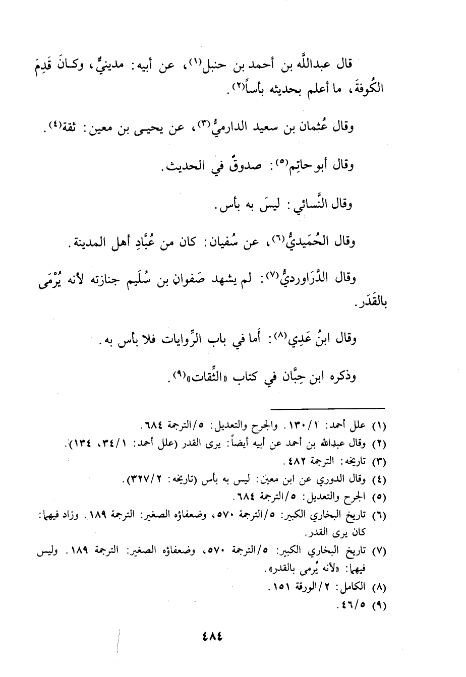 (6) تاريخ البخاري الكبير: 5 / الترجمة 570، وضعفاؤه الصغير: الترجمة 189. وزاد فيهما: كان يرى القدر.