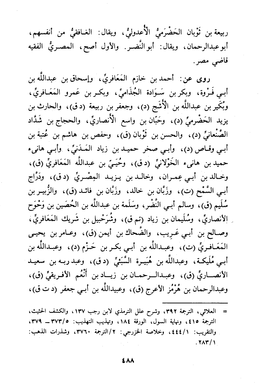 ربيعة بن ثوبان الحضرمي الأعدولي، ويُقال: الغافقي من أنفسهم، أبو عَبْد الرحمن، ويُقال: أبو النضر. والأول أصح، المِصْرِي الفقيه قاضي مصر.