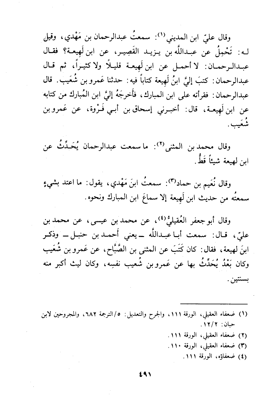 وَقَال علي ابن المديني (1) : سمعت عبد الرحمن بن مَهْدِيٍّ، وقِيلَ لَهُ، تحمل عَن عَبد اللَّهِ بْنِ يزيد القصير، عَن ابْنِ لَهِيعَة؟ فَقَالَ عَبْد الرَّحْمَنِ، لا أحمل عَنِ ابْنِ لَهِيعَة قليلا ولا كثيرا: ثم قال عَبْدُ الرَّحْمَنِ: كتب إلي ابن لَهِيعَة كتابا فِيهِ، حَدَّثَنَا عَمْرو بن شعيب. قال عَبْدُ الرَّحْمَنِ: فقرأته على ابن المبارك، فأخرجه إلي ابن المبارك من كتابه عَن ابْنِ لَهِيعَة، قال: أَخْبَرَنِي إسحاق بن أَبي فروة، عَن عَمْرو بْن شعيب.