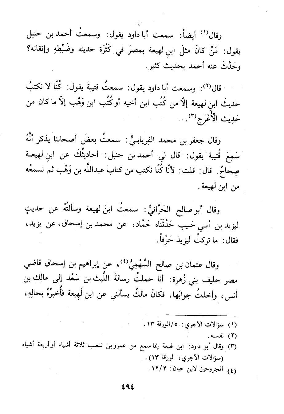 قال (2) : وسمعت أبا دَاوُد يَقُولُ: سَمِعْتُ قُتَيْبَةَ يَقُولُ: كُنَّا لا نَكْتُبُ حَدِيثَ ابْنِ لَهِيعَة إِلا مِنْ كُتُبِ ابْنِ أَخِيهِ أَوْ كتب ابن وهب إلا ماكان مِنْ حَدِيثِ الأَعْرَجِ (3) .