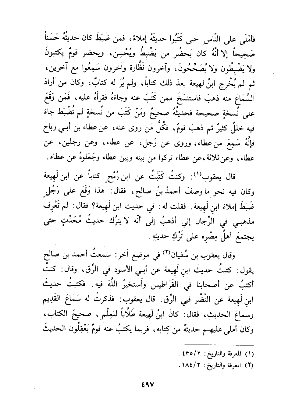 وَقَال يعقوب بْن سفيان (2) في موضع آخر: سمعت أحمد بن صَالِحٍ يَقُولُ: كتبت حديث ابن لَهِيعَة عَن أَبِي الأسود فِي الرق، وَقَال: كنت اكتب عن أصحابنا فِي القراطيس واستخير الله فِيهِ. فكتبت حديث ابن لَهِيعَة عن النضر فِي الرق. قال يعقوب: فذكرت له سماع الكتاب، وكان أملى عليهم حديثه من كتابه، فربما يكتب عَنْهُ قوم يعقلون الحديث