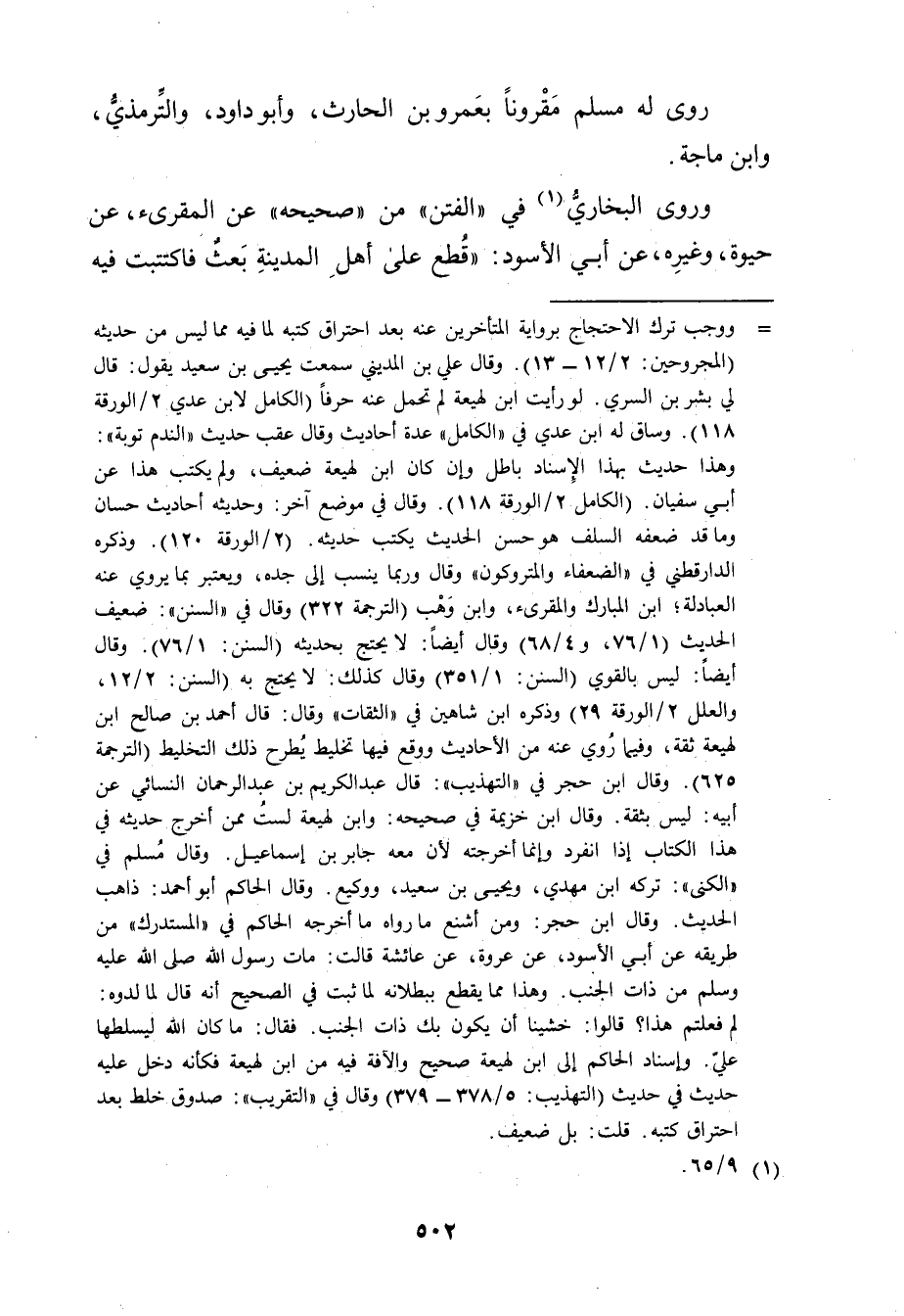 (2 / الورقة 120) ، وذَكَره الدارقطني في "الضعفاء والمتروكون"وَقَال وربما ينسب إلى جَدِّه، ويعتبر بما يروي عنه العبادلة، ابن المبارك والمقرئ وابن وهب (الترجمة 322) وَقَال في "السنن": ضعيف الحديث (1 / 76، و4 / 68) وَقَال أيضا: لا يحتج بحديثه (السنن: 1 / 76) . وَقَال أيضا: ليس بالقوي (السنن: 1 / 351) وَقَال كذلك: لا يحتج به (السنن: 2 / 12، والعلل 2 / الورقة 29) وذكره ابن شاهين في "الثقات" وَقَال: قال أحمد بن صالح ابن لَهِيعَة ثقة، وفيما روي عنه من الاحاديث ووقع فيها تخليط يطرح ذلك التخليط (الترجمة 625) . وَقَال ابن حجر في "التهذيب": قال عبد الكريم بن عبد الرحمن النَّسَائي عَن أبيه: ليس بثقة. وَقَال ابن خزيمة في صحيحه: وابن لَهِيعَة لست ممن أخرج حديثه في "الكنى": تركه ابن مهدي، ويحيى بن سَعِيد، ووكيع. وَقَال الحاكم أبو أحمد: ذاهب الحديث. وَقَال ابن حجر: ومن أشنع ما رواه ما أخرجه الحاكم في "المستدرك"من طريقه عَن أبي الأسود، عن عروة، عن عائشة قالت: مات رسول الله صلى الله عليه وسلم من ذات الجنب. وهذا مما يقطع ببطلانه لما ثبت في الصحيح أنه قال لما لدوه: لم فعلتم هذا؟ قالوا: خشينا أن يكون بك ذات الجنب. فقال: ما كان الله ليسلطها علي.