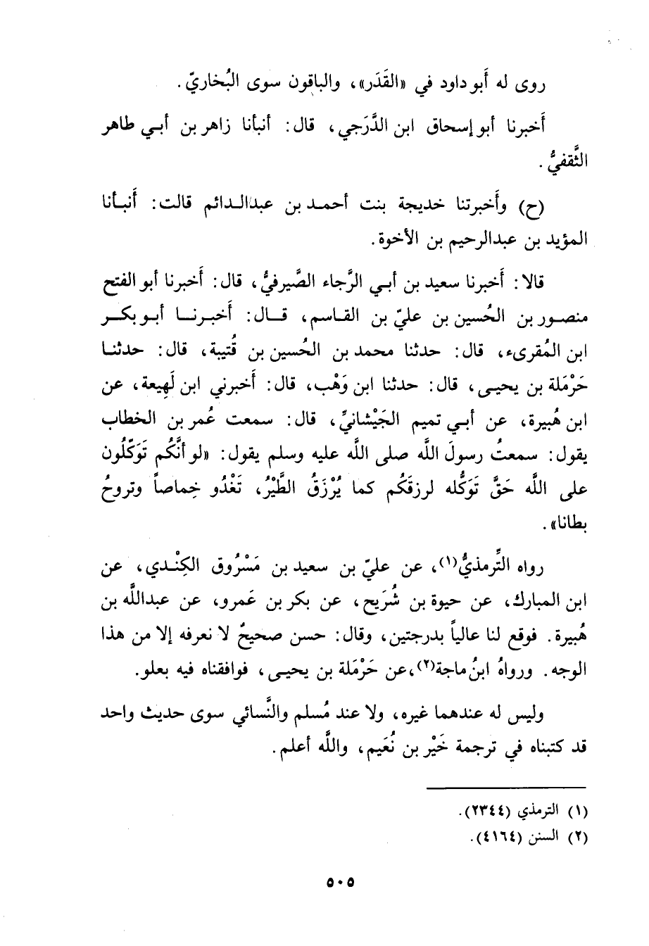 قَالا: أخبرنا سَعِيد بْنُ أَبي الرَّجَاءِ الصَّيْرَفِيُّ، قال: أخبرنا أَبُو الْفَتْحِ مَنْصُورُ بْن الحسين بْن علي بْن الْقَاسِمِ، قال: أخبرنا أَبُو بَكْرٍ بْنُ الْمُقْرِئِ، قال: حَدَّثَنَا مُحَمَّدُ بْنُ الْحُسَيْنِ بْنِ قُتَيْبَةَ، قال: حَدَّثَنَا حَرْمَلَةُ بْنُ يَحْيَى، قال حَدَّثَنَا ابن وهب، قال: أخبرني ابْنُ لَهِيعَة، عَنِ ابْنِ هُبَيْرَةَ، عَن أَبِي تَمِيمٍ الْجَيْشَانِيِّ، قال: سَمِعْتُ عُمَر بْنَ الْخَطَّابِ يَقُولُ: سمعت رَسُول اللَّهِ صَلَّى اللَّهُ عَلَيْهِ وسَلَّمَ يَقُولُ: لَوْ أَنَّكُمْ توكلون عَلَى اللَّهِ حَقَّ تَوَكُّلِهِ لَرَزَقَكُمْ كَمَا يَرْزُقُ الطَّيْرَ، تَغْدُو خِمَاصًا وتَرُوحُ بِطَانًا.