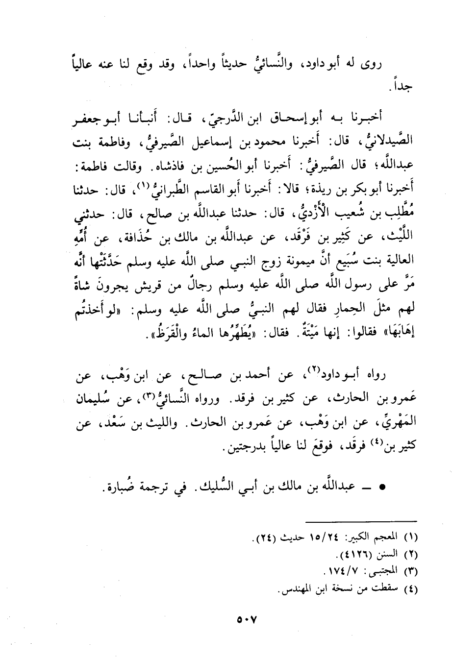 أَخْبَرَنَا بِهِ أَبُو إِسْحَاقَ ابْنُ الدَّرَجِيِّ، قال: أنبأنا أَبُو جَعْفَرٍ الصيد لاني، قال: أَخْبَرَنَا مَحْمُودُ بْنُ إِسْمَاعِيلَ الصَّيْرَفِيُّ، وفَاطِمَةُ بِنْتُ عَبد اللَّهِ، قال الصَّيْرَفِيُّ: أَخْبَرَنَا أَبُو الْحُسَيْنِ بْنِ فَاذْشَاهِ. وَقَالت فَاطِمَةُ: أخبرنا أَبُو بَكْرِ بْنُ رِيذَةَ، قَالا: أخبرنا أَبُو الْقَاسِمِ الطَّبَرَانِيُّ (1) ، قال: حَدَّثَنَا مطلب بْن شعيب الأزدي، قال: حَدَّثَنَا عَبد اللَّهِ بْن صَالِحٍ، قال: حَدَّثَنِي اللَّيْثُ، عَنْ كَثِيرِ بْنِ فَرْقَدٍ، عَنْ عَبد اللَّهِ بن مالك بن حذافة، عن أُمِّه العالية بنت سبيع أَنَّ مَيْمُونَةَ زَوْجَ النَّبِيِّ صَلَّى اللَّهُ عَلَيْهِ وسَلَّمَ حَدَّثَتْهَا أَنَّهُ مَرَّ عَلَى رَسُولِ اللَّهِ صَلَّى اللَّهُ عَلَيْهِ وسَلَّمَ رِجَالٌ مِنْ قُرَيْشٍ يَجُرُّونَ شَاةً لَهُمْ مِثْلَ الْحِمَارِ فَقَالَ لَهْمُ النَّبِيُّ صَلَّى اللَّهُ عَلَيْهِ وسَلَّمَ: لَوْ أَخَذْتُمْ إِهَابَهَا"فَقَالُوا: إِنَّها مَيْتَةٌ. فَقَالَ: يُطَهِّرُهَا الْمَاءُ والْقَرَظُ.