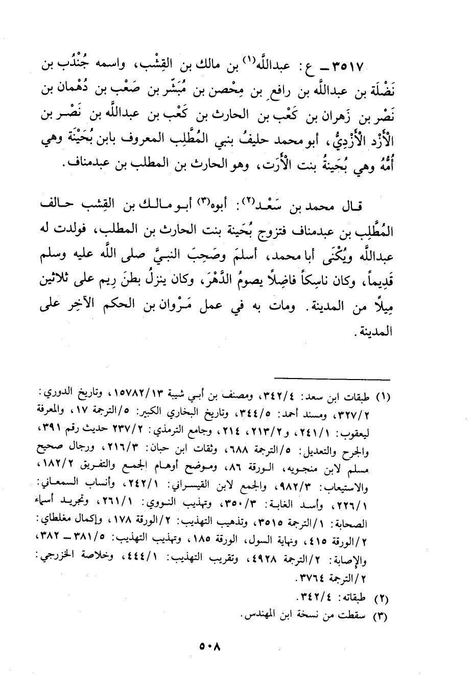 3517 - ع: عَبد اللَّهِ بْن مالك بْن القشب (1) ، واسمه جندب بن نضلة بن عَبد اللَّهِ بن رافع بن محصن بن مبشر بن صعب بن دهمان بن نصربن زهران بن كعب بن الْحَارِثِ بْن كعب بْن عَبد اللَّهِ بن نصربن الأزد الأزدي، أَبُو محمد حليف بنبي المطلب المعروف بابن بحينة وهي أمه وهي بحينة بنت الأرت، وهو الحارث بن عبد مناف.