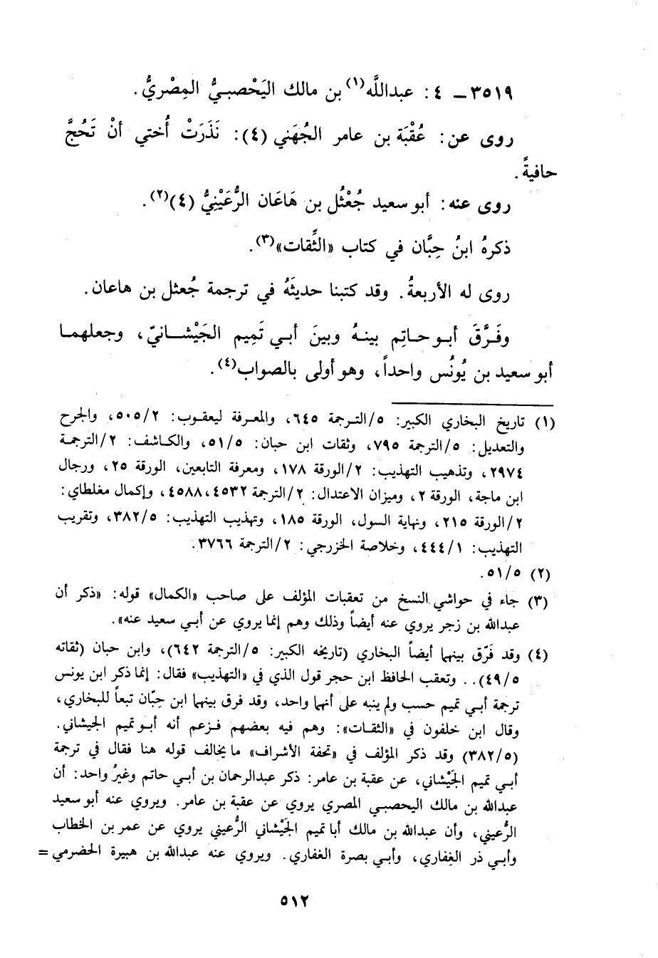 (4) وقد فرق بينهما أيضا البخاري (تاريخه الكبير: 5 / الترجمة 642) ، وابن حبان (ثقاته 5 / 49) ..وتعقب الحافظ ابن حجر قول الذي في "التهذيب"فقال: إنما ذكر ابن يونس ترجمة أبي تميم حسب ولم ينبه على أنهما واحد، وقد فرق بينهما ابن حبان تبعا للبخاري، وَقَال ابن خلفون في "الثقات": وهم فيه بعضهم فزعم أنه أبو تميم الجيشاني. (5 / 382) وقد ذكر المؤلف في "تحفة الاشراف"ما يخالف قوله هنا فقال في ترجمة أبي تميم الجيشاني، عن عقبة بن عامر: ذكر عبد الرحمن بن أَبي حاتم وغير واحد: ان عَبد الله بن مالك اليحصبي المِصْرِي يروي عن عقبة بن عامر. ويروي عنه أبو سَعِيد الرعيني، وأن عَبد الله بن مالك أبا تميم الجيشاني الرعيني يروي عن عُمَر بن الخطاب وأبي ذر الغفاري، وأبي بصرة الغفاري. ويروي عنه عَبد الله بن هبيرة الحضرمي وغيره وجعلوهما اثنين، وهو أولى بالصواب، والله أعلم (تحفة الاشراف: 7 / 309 - 310) ولعل المؤلف عدل عن رأيه الاول، والصواب أنهما اثنان إن شاء الله، والله أعلم. وذكره الذهبي في "الميزان"وَقَال: تفرد عنه أبو سَعِيد جعثل الرعيني (2 / الترجمة 4588) ، وَقَال ابن حجر في "التقريب": صدوق.
