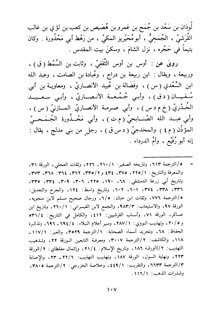= 5 / الترجمة 613، وتاريخه الصغير: 1 / 210، 226، وثقات العجلي، الورقة 31، والمعرفة والتاريخ: 1 / 225، 375، 434 و2 / 335، 362، 364: 368، 373، وتاريخ أبي زرعة الدمشقي: 68، 190، 225، 306، 309، 334، 335، 336، 338، 374، 601، 602، وتاريخ واسط: 124، والجرح والتعديل: 5 / الترجمة 776، وثقات ابن حبان: 5 / 6، ورجال صحيح مسلم لابن منجويه، الورقة 98، والاستيعاب: 3 / 983، والجمع لابن القيسراني: 1 / 260، وتاريخ ابن عساكر، الورقة 71، وأنساب القرشيين: 412، والكامل في التاريخ: 4 / 531 و5 / 20، وتهذيب النووي: 1 / 287، وسير أعلام النبلاء: 4 / 694 - 696، وتذكرة الحفاظ: 68، وتجريد أسماء الصحابة: 1 / الترجمة 3529، والعبر: 1 / 117 -