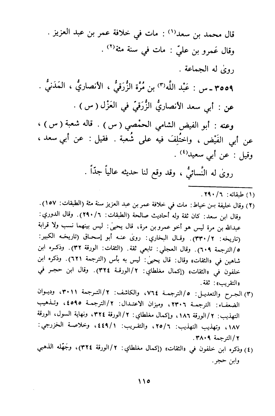 (3) الجرح والتعديل: 5 / الترجمة 764، والكاشف: 2 / الترجمة 3011، وديوان الضعفاء: الترجمة 2306، وميزان الاعتدال: 2 / الترجمة 4595، وتذهيب التهذيب: 2 / الورقة 186، وإكمال مغلطاي: 2 / الورقة 324، ونهاية السول، الورقة 187، وتهذيب التهذيب: 6 / 25، والتقريب: 1 / 449، وخلاصة الخزرجي: 2 / الترجمة 3809.