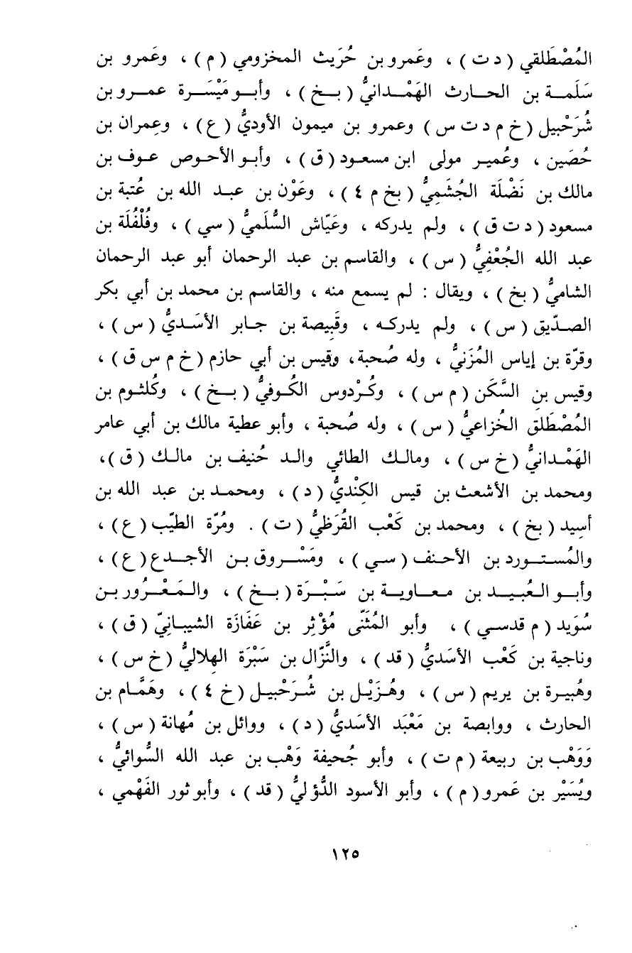 المصطلقي (د ت) ، وعَمْرو بْن حريث المخزومي (م) ، وعَمْرو بْن سلمة بن الحارث الهمداني (بخ) ، وأَبُو ميسرة عَمْرو بْن شرحبيل (خ م د ت س) وعَمْرو بْن ميمون الأَودِيّ (ع) ، وعِمْران بْن حصين، وعمير مولى ابْن مسعود (ق) ، وأَبُو الأَحوص عوف بْن مالك بْن نضلة الجشمي (بخ م 4) ، وعون بْن عَبد الله بْن عتبة بْن مسعود (د ت ق) ، ولم يدركه، وعياش السلمي (سي) ، وفلفلة بْن عَبد اللَّهِ الجعفي (س) ، والقاسم بْن عَبْد الرَّحْمَنِ أَبُو عَبْدِ الرَّحْمَنِ الشامي (بخ) ، ويُقال: لم يسمع منه، والقاسم بْن مُحَمَّد بْن أَبي بكر الصِّدِّيقِ (س) ، ولم يدركه، وقبيصة بْن جابر الأسدي (س) ، وقرة بْن إياس المزني، وله صحبة، وقيس بْن أَبي حازم (خ م س ق) ، وقيس بن السكن (م س) ، وكردوس الكوفي (بخ) ، وكلثوم بْن المصطلق الخزاعي (س) ، وله صحبة، وأَبُو عطية مالك بْن أَبي عامر الْهَمْدَانِيّ (خ س) ، ومالك الطائي والد حنيف بْن مالك (ق) ، ومُحَمَّد بْن الأشعث بْن قيس الكندي (د) ، ومحمد بْن عَبد اللَّهِ بْن أسيد (بخ) ، ومُحَمَّد بْن كعب القرظي (ت) . ومرة الطيب (ع) ، والمستورد بْن الأَحنف (سي) ، ومسروق بن الأجدع (ع) ، وأبو العُبَيد بْن معاوية بْن سبرة (بخ) ، والمعرور بْن سويد (م قدسي) ، وأَبُو المثنى مؤثر بْن عفازة الشيباني (ق) ، وناجية بْن كعب الأسدي (قد) ، والنزال بْن سبرة الهلالي (خ س) ، وهبيرة بْن يريم (س) ، وهزيل بْن شرحبيل (خ 4) ، وهمام بْن الحارث، ووابصة بْن معبد الأسدي (د) ، ووائل بْن مهانة (س) ، ووهب بْن ربيعة (م ت) ، وأَبُو جحيفة وهب بْن عَبد اللَّهِ السوائي، ويسير بْن عَمْرو (م) ، وأَبُو الأسود الدؤلي (قد) ، وأَبُو ثور الفهمي،