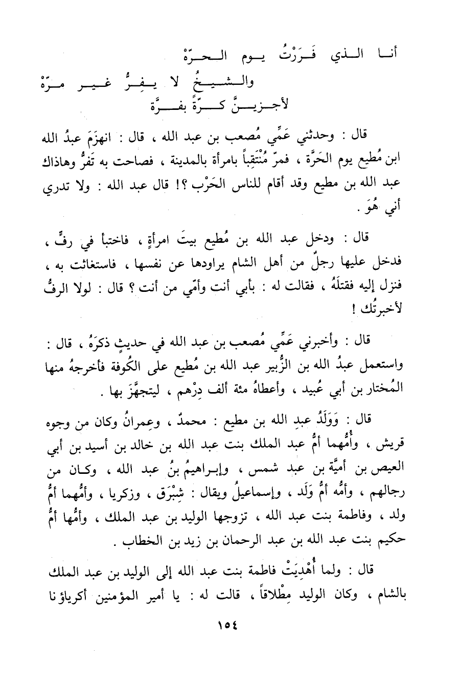 قال: وحدثني عمي مصعب بْن عَبد اللَّهِ، قال: انهزم عَبد اللَّهِ بْن مطيع يوم الحرة، فمر منتقبا بامرأة بالمدينة، فصاحت بِهِ تفر وهاذاك عَبد اللَّهِ بْن مطيع وقد أقام للناس الحرب؟ ! قال عَبد اللَّهِ: ولا تدري أني هُوَ.
