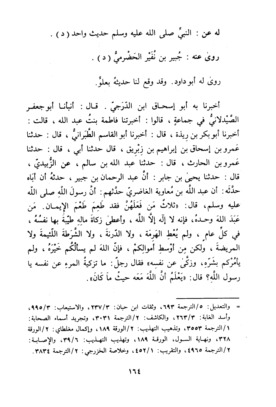 أَخْبَرَنَا بِهِ أَبُو إِسْحَاقَ ابْنُ الدَّرَجِيِّ. قال: أَنْبَأَنَا أَبُو جَعْفَرٍ الصَّيْدَلانِيُّ فِي جَمَاعَةٍ، قَالُوا: أَخْبَرَتْنا فَاطِمَةُ بِنْتُ عَبد اللَّهِ، قَالَتْ: أخبرنا أَبُو بَكْرِ بْنُ رِيذَةَ، قال: أخبرنا أَبُو الْقَاسِمِ الطَّبَرَانِيُّ، قال: حَدَّثَنَا عَمْرو بْنُ إِسْحَاقَ بْنِ إِبْرَاهِيمَ بْنِ زِبْرِيقٍ، قال حَدَّثَنَا أَبِي، قال: حَدَّثَنَا عَمْرو بْنُ الْحَارِثِ، قال: حَدَّثَنَا عَبد اللَّهِ بْنُ سَالِمٍ، عَنِ الزُّبَيْدِيِّ، قال: حَدَّثَنَا يَحْيَى بْنُ جَابِرٍ: أَنَّ عَبْدَ الرَّحْمَنِ بْنَ جُبَيْرٍ، حَدَّثَهُ أَنَّ أَبَاهُ حَدَّثَهُ: أَنَّ عَبد اللَّهِ بْنَ مُعَاوِيَةَ الْغَاضِرِيَّ حَدَّثَهُمْ: أَنَّ رَسُولَ اللَّهِ صلى الله عليه وسلم، قال: ثَلاثٌ مَنْ فَعَلَهُنَّ فَقَدْ طَعِمَ طَعْمَ الإِيمَانَ. مَنْ عَبد اللَّهَ وحْدَهُ، فَإِنَّهُ لا إِلَهَ إِلا اللَّهَ، وأَعْطَى زَكَاةَ مَالِهِ طَيِّبَةً بِهَا نَفْسُهُ، فِي كُلِّ عَامٍ، ولَمْ يُعْطِ الْهَرِمَةَ، ولا الدَّرِنَةَ، ولا الشرطة اللَّئِيمَةَ ولا الْمَرِيضَةَ، ولَكِنْ مِنْ أَوْسَطِ أَمْوَالِكُمْ، فَإِنَّ اللَّهَ لَمْ يَسْأَلْكُمْ خَيْرَهُ، ولَمْ يَأْمُرْكُمْ بِشَرِّهِ، وزَكَّى عَنْ نَفْسِهِ"فَقَالَ رَجُلٌ: مَا تَزْكِيَةُ الْمَرْءِ عَنْ نَفْسِهِ يَا رَسُولَ اللَّهِ؟ قال: يَعْلَمُ أَنَّ اللَّهَ مَعَهُ حَيْثُ مَا كان.