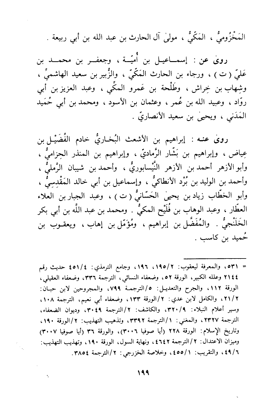 = 531، والمعرفة ليعقوب: 2 / 195، 196، وجامع التِّرْمِذِيّ: 4 / 451 حديث رقم 2144 وعلله الكبير، الورقة 52، وضعفاء النَّسَائي، الترجمة 336، وضعفاء العقيلي، الورقة 112، والجرح والتعديل: 5 / الترجمة 799، والمجروحين لابن حبان: 2 / 21، والكامل لابن عدي: 2 / الورقة 133، وضعفاء أبي نعيم، الترجمة 108، وسير أعلام النبلاء: 9 / 320، والكاشف: 2 / الترجمة 3049، وديوان الضعفاء، الترجمة 2327، والمغني: 1 / الترجمة 3392، وتذهيب التهذيب: 2 / الورقة 190، وتاريخ الاسلام: الورقة 228 (أيا صوفيا 3006) ، والورقة 36 (أيا صوفيا 3007) وميزان الاعتدال: 2 / الترجمة 4642، ونهاية السول، الورقة 190، وتهذيب التهذيب: 6 / 49، والتقريب: 1 / 455، وخلاصة الخزرجي: 2 / الترجمة 3854.