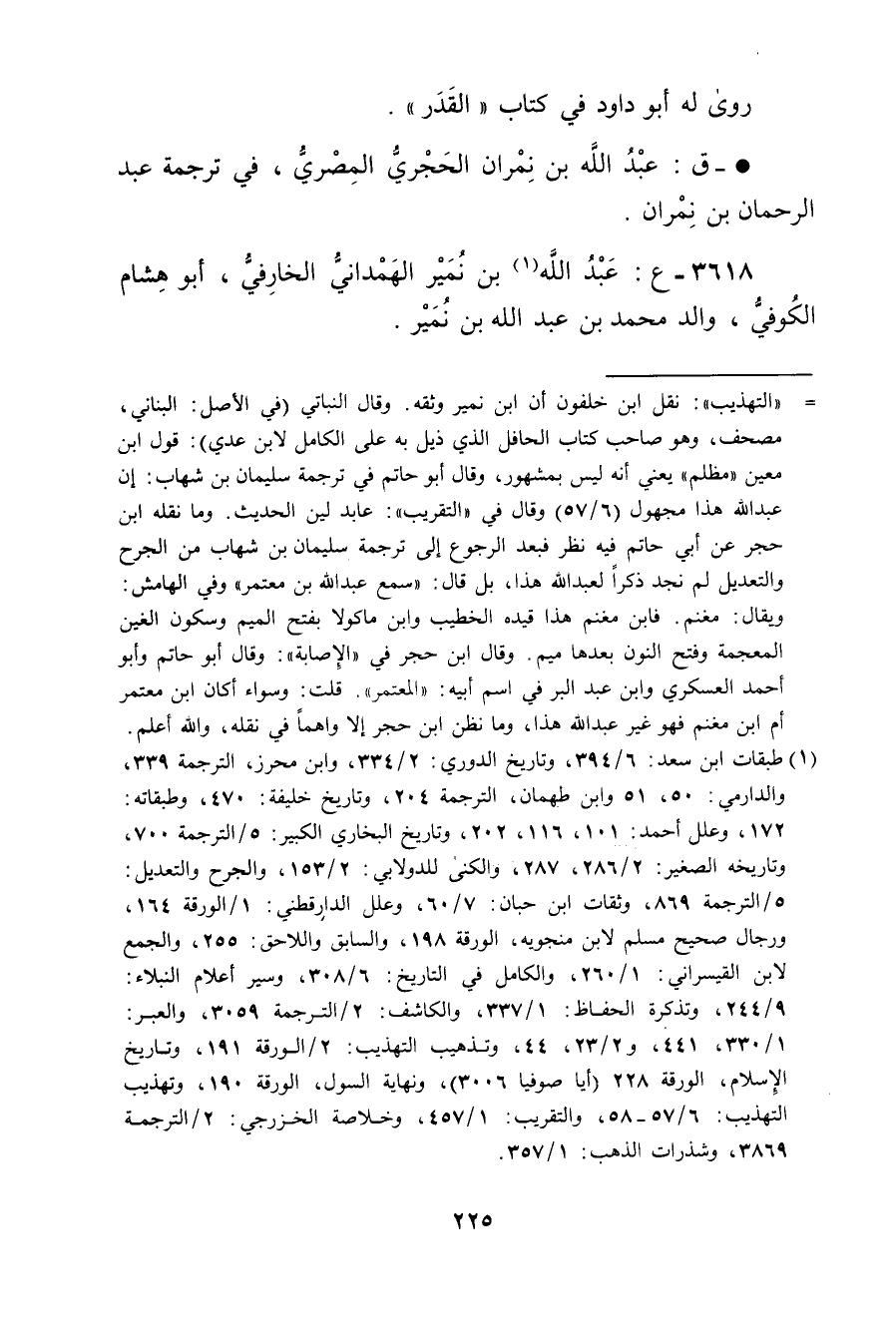 3618 - ع: عَبد اللَّهِ بن نمير الهمداني الخارقي (1) ، أَبُو هِشَام الكوفي، والد مُحَمَّد بْن عَبد اللَّهِ بْن نمير.