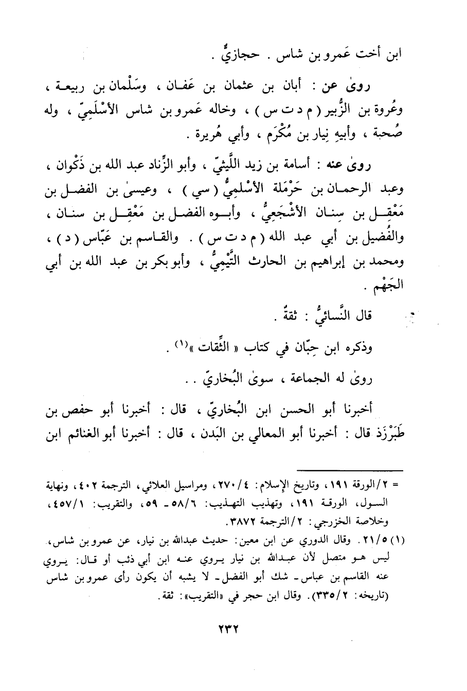 (1) 5 / 21. وَقَال الدوري عن ابن مَعِين: حديث عَبد اللَّهِ بْنِ نِيَارٍ، عَنْ عَمْرو بن شاس، ليس هو متصل لان عَبد الله بن نيار يروي عنه ابن أَبي ذئب أو قال: يروي عنه القاسم بن عباس - شك أبو الفضل - لا يشبه أن يكون رأى عَمْرو بن شاس (تاريخه: 2 / 335) . وَقَال ابن حجرفي"التقريب": ثقة.