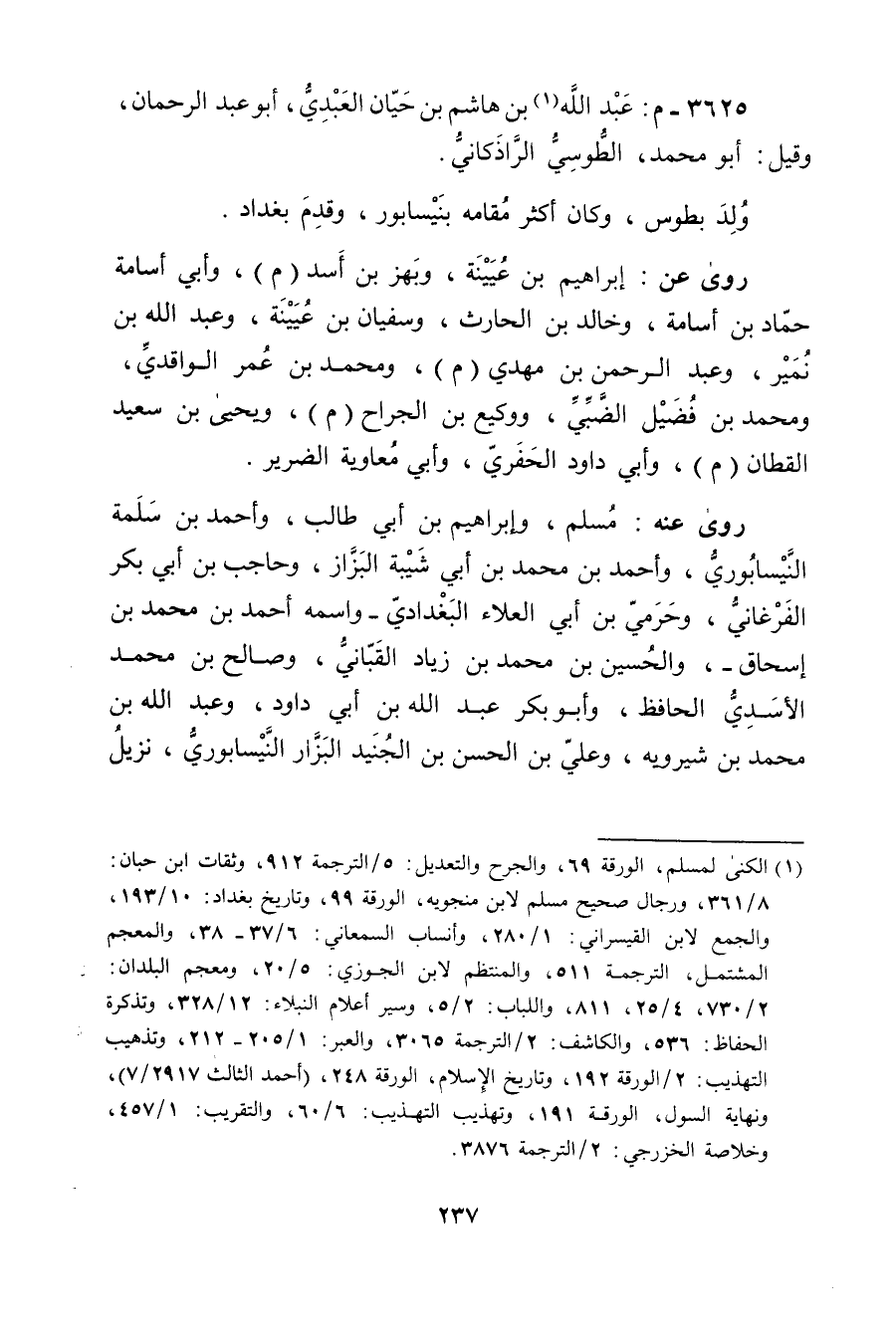3625 - م: عَبد اللَّهِ بن هاشم بن حيان العبدي (1) ، أَبُو عَبْدِ الرَّحْمَنِ، وقيل: أَبُو مُحَمَّد، الطوسي الراذكاني.
