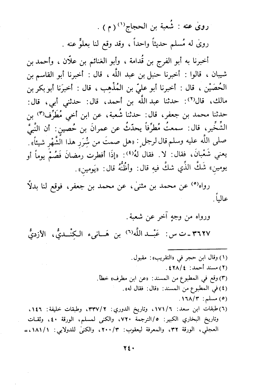 شَيْبَانَ، قَالُوا: أَخْبَرَنَا حنبل بْن عَبد الله، قال: أَخْبَرَنَا أبو القاسم بْن الحصين، قال: أَخْبَرَنَا أبو علي بْن المذهب، قال: أَخْبَرَنَا أبو بكر بْن مالك، قال (2) : حَدَّثَنَا عَبد اللَّهِ بْن أَحْمَدَ، قال: حَدَّثني أَبِي، قال: حَدَّثَنَا مُحَمَّدُ بْنُ جَعْفَرٍ، قال: حَدَّثَنَا شُعْبَةُ، عَنِ ابْنِ أَخِي مُطَرِّفِ (3) بْنِ الشِّخِّيرِ، قال: سَمِعْتُ مُطَرِّفًا يُحَدِّثُ عَنْ عِمْران بْنِ حُصَيْنٍ: أَنَّ النَّبِيُّ صلى الله عليه وسلم قال لِرَجُلٍ: هَلْ صُمْتَ مِنْ سَرَرِ هَذَا الشَّهْرِ شَيْئًا". يَعْنِي شَعْبَانَ، فَقَالَ: لا. فَقَالَ لَهُ (4) : إِذَا أَفْطَرْتَ رَمَضَانَ فَصُمْ يَوْمًا أَوْ يَوْمَيْنِ"شَكَّ الَّذِي شَكَّ فِيهِ قال: وأَظُنُّهُ قال: يَوْمَيْنِ.