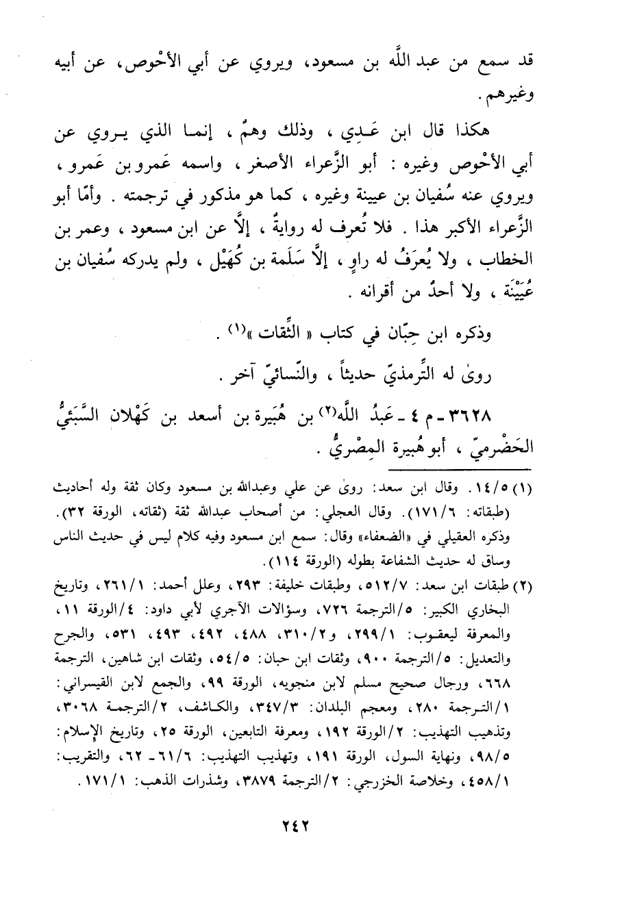 (1) 5 / 14. وَقَال ابن سعد: روى عن علي وعبد الله بن مسعود وكان ثقة وله أحاديث (طبقاته: 6 / 171) . وَقَال العجلي: من أصحاب عَبد الله ثقة (ثقاته، الورقة 32) ، وذَكَره العقيلي في "الضعفاء"وَقَال: سمع ابن مسعود وفيه كلام ليس في حديث الناس وساق له حديث الشفاعة بطوله (الورقة 114) .