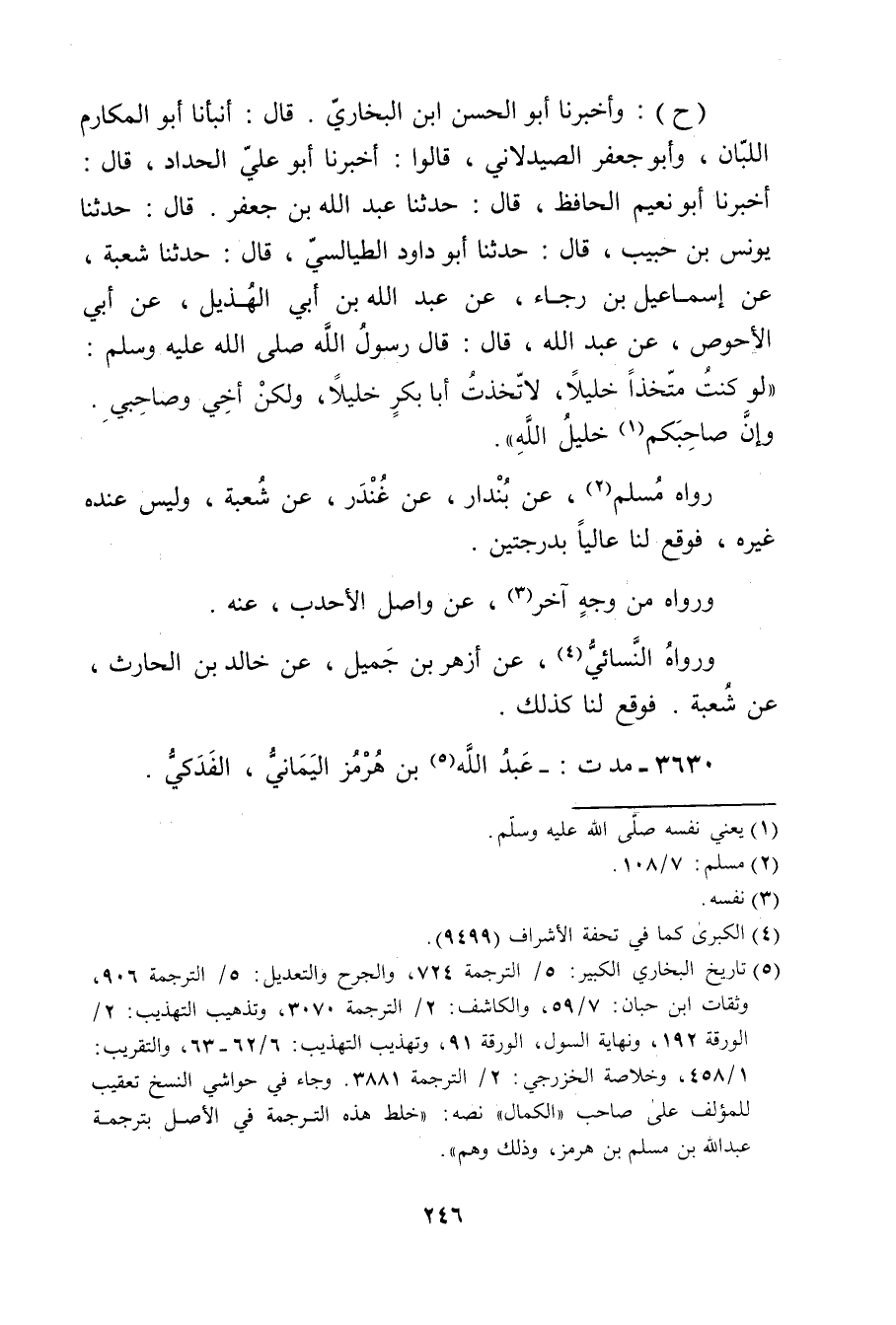 (ح) : وأخبرنا أَبُو الْحَسَنِ بْنُ الْبُخَارِيّ. قال: أنبأنا أَبُو المكارم اللَّبَّانُ، وأَبُو جَعْفَرٍ الصَّيْدَلانِيُّ، قَالُوا: أَخْبَرَنَا أَبُو عَلِيّ الحداد، قال: أَخْبَرَنَا أبو نعيم الحافظ، قال: حَدَّثَنَا عَبد الله بْن جعفر. قال: حَدَّثَنَا يُونُسُ بْنُ حَبِيبٍ، قال: حَدَّثَنَا أبو داود الطيالسي، قال: حَدَّثَنَا شُعْبَةُ، عَنْ إِسْمَاعِيلَ بْنِ رِجَاءٍ، عَنْ عَبد اللَّهِ بْنِ أَبي الْهُذَيْلِ، عَن أَبِي الأَحوص، عَنْ عَبد اللَّهِ، قال: قال رَسُولُ اللَّهِ صلى الله عليه وسلم: لَوْ كُنْتُ مُتَّخِذًا خليلا، لا تخذت أَبَا بَكْرٍ خَلِيلا، ولَكِنْ أَخِي وصَاحِبِي. وإِنَّ صَاحِبَكُمْ (1) خَلِيلُ اللَّهِ.