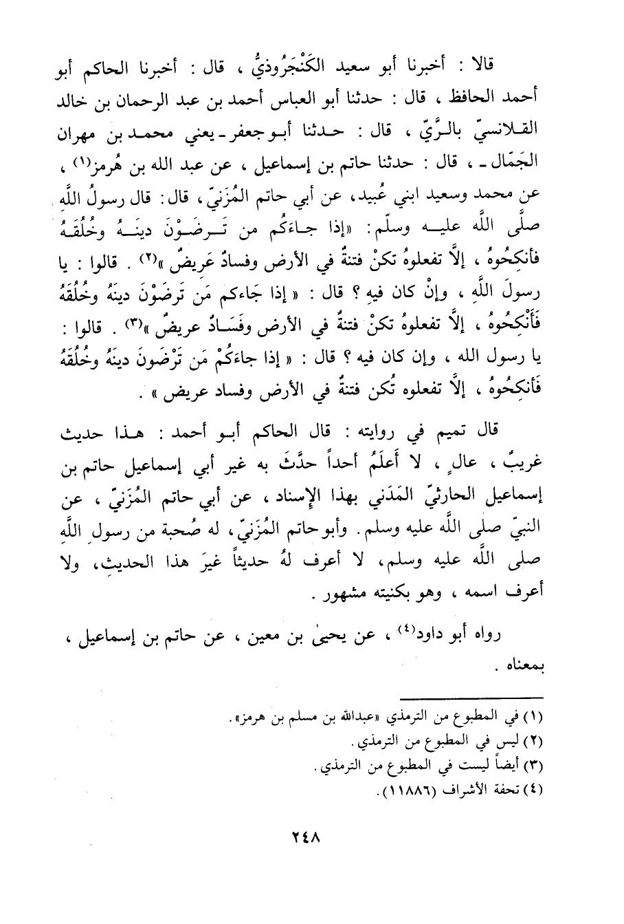 قالا: أَخْبَرَنَا أَبُو سَعِيد الْكَنْجَرُوذِيُّ، قال: أَخْبَرَنَا الْحَاكِمُ أَبُو أَحْمَدَ الْحَافِظُ، قال: حَدَّثَنَا أَبُو الْعَبَّاسِ أَحْمَدُ بن عَبْد الرحمن بن خالد الْقُلانِسِيُّ بِالرَّيِّ، قال: حَدَّثَنَا أَبُو جَعْفَرٍ، يَعْنِي مُحَمَّدَ بْنَ مِهْرَانَ الْجَمَّالُ، قال: حَدَّثَنَا حَاتِمُ بْنُ إِسْمَاعِيل، عَنْ عَبد اللَّهِ بْن هُرْمُزٍ (1) ، عَنْ مُحَمَّدٍ وسَعِيد ابْنَيْ عُبَيد، عَن أَبِي حَاتِمٍ الْمُزَنِيِّ، قال: قال رَسُولُ اللَّهِ صلى الله عليه وسلم: إِذَا جَاءَكُمْ من ترضون دينه وخلقه فأنكحوه، إِلا تَفْعَلُوهُ تَكُنْ فِتْنَةٌ فِي الأَرْضِ وفَسَادٌ عَرِيضٌ" (2) . قَالُوا: يَا رَسُولَ اللَّهِ، وإِنْ كَانَ فِيهِ؟ قال: إذا جاء كم من ترضون دينه وخلقه فأنكحوه، إِلا تَفْعَلُوهُ تَكُنْ فِتْنَةٌ فِي الأَرْضِ وفَسَادٌ عَرِيضٌ" (3) . قَالُوا: يَا رَسُولَ اللَّهِ، وإِنْ كَانَ فِيهِ؟ قال: إِذَا جَاءَكُمْ مَنْ تَرْضَوْنَ دِينَهُ وخُلُقَهُ فَأَنْكِحُوهُ، إِلا تَفْعَلُوهُ تَكُنْ فِتْنَةٌ فِي الأَرْضِ وفَسَادٌ عَرِيضٌ.