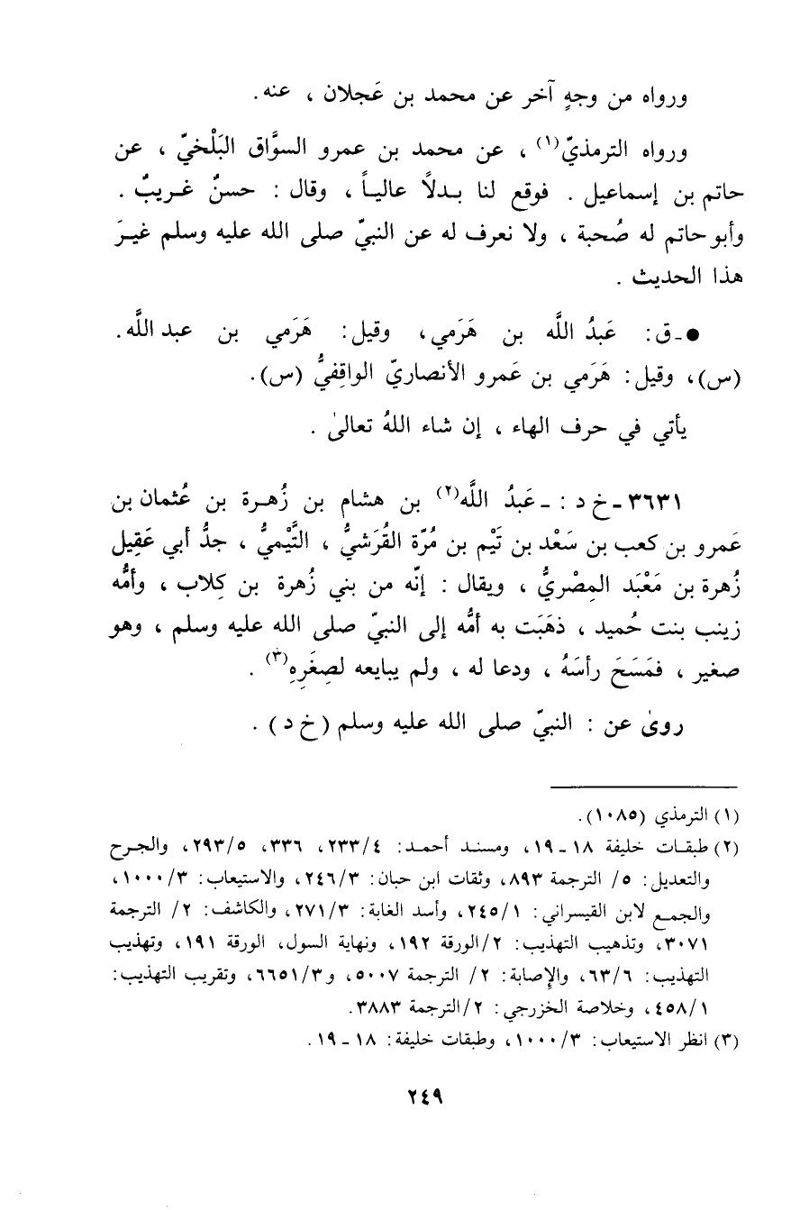 3631 - خ د: - عَبد الله بن هشام بن زهرة بْن عثمان بْن عَمْرو بْن كعب بن سعد بن تيم بن مره القرشئ (2) ، التَّيْمِيّ، جد أبي عقيل زهرة بن معبد المِصْرِي، ويُقال: إنه من بني زهرة بْن كلاب، وأمه زينب بنت حميد، ذهبت بن أمه إِلَى النَّبِيّ صلى الله عليه وسلم، وهُوَ صغير، فمسح رأسه، ودعا لَهُ، ولم يبايعه لصغره (3) .