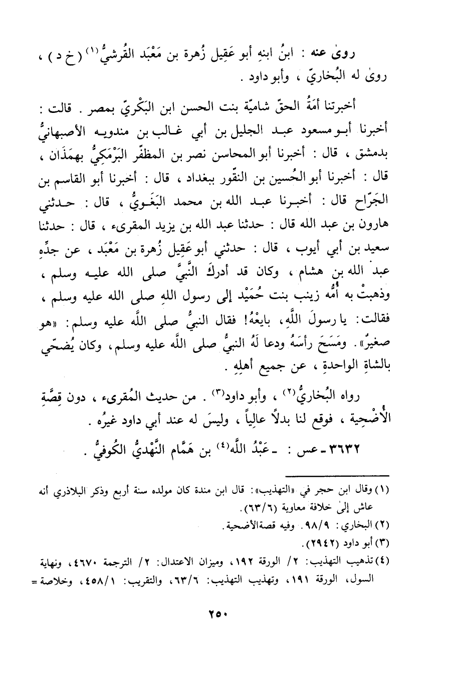 أَخْبَرَتْنَا أَمَةُ الْحَقِّ شَامِيَّةُ بِنْتُ الْحَسَنِ بْنِ الْبَكْرِيِّ بِمِصْرَ. قَالَتْ: أخبرنا أَبُو مَسْعُودٍ عَبْدُ الْجَلِيلِ بْنُ أَبي غَالِبِ بْنِ مَنْدَوَيْهِ الأَصْبَهَانِيُّ بِدِمَشْقَ، قال: أخبرنا أَبُو الْمَحَاسِنِ نَصْرُ بْنُ الْمُظَفَّرِ الْبَرْمَكِيُّ بِهَمَذَانَ، قال: أخبرنا أَبُو الْحُسَيْنِ بْنُ النَّقُّورِ بِبَغْدَادَ، قال: أَخْبَرَنَا أبو القاسم بْن الْجَرَّاحِ قال: أَخْبَرَنَا عَبد اللَّهِ بْنُ مُحَمَّدٍ الْبَغَوِيُّ، قال: حَدَّثَنِي هَارُونُ بْنُ عَبد اللَّهِ قال: حَدَّثَنَا عَبد اللَّهِ بْنُ يَزِيدَ الْمُقْرِئُ، قال: حَدَّثَنَا سَعِيد بْنُ أَبي أَيُّوبَ، قال: حَدَّثَنِي أَبُو عَقِيلٍ زُهْرَةُ بْنُ مَعْبَدٍ، عَنْ جَدِّهِ عَبد اللَّهِ بْنِ هِشَامٍ، وكَانَ قد أدرك النَّبِيّ صَلَّى الله عليه وسلم، وذَهَبَتْ بِهِ أُمُّهُ زَيْنَبُ بِنْتُ حُمَيْدٍ إِلَى رَسُول اللَّهِ صلى الله عليه وسلم، فَقَالَتْ: يَا رَسُولَ اللَّهِ، بَايِعْهُ! فَقَالَ النَّبِيُّ صلى الله عليه وسلم: هُوَ صَغِيرٌ". ومَسَحَ رَأْسَهُ ودَعَا لَهُ النَّبِيُّ صلى الله عليه وسلم، وكَانَ يُضَحِّي بِالشَّاةِ الْوَاحِدَةِ، عَنْ جَمِيعِ أَهْلِهِ.