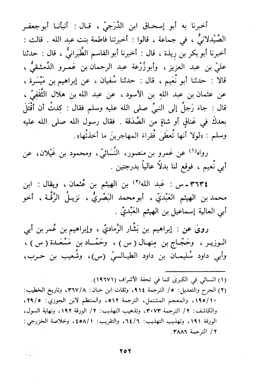 أَخْبَرَنَا بِهِ أَبُو إِسْحَاقَ ابْنُ الدَّرَجِيِّ، قال: أنبأنا أَبُو جَعْفَرٍ الصَّيْدَلانِيُّ، فِي جَمَاعَةٍ، قَالُوا: أَخْبَرَتْنا فَاطِمَةُ بِنْتُ عَبد اللَّهِ. قَالَتْ: أخبرنا أَبُو بَكْرِ بْنُ رِيذَةَ، قال: أخبرنا أَبُو الْقَاسِمِ الطَّبَرَانِيُّ، قال: حَدَّثَنَا علي بْن عبد الْعَزِيزِ، وأَبُو زُرْعَة عَبْدُ الرَّحْمَنِ بْنُ عَمْرو الدِّمَشْقِيُّ، قَالا: حَدَّثَنَا أَبُو نعيم، قال: حَدَّثَنَا سفيان، عَنْ إِبْرَاهِيمَ بْنِ مَيْسَرَةَ، عَنْ عثمان بْن عَبد اللَّهِ بْن الأَسْوَدِ، عَنْ عَبد اللَّهِ بْنِ هِلالٍ الثَّقَفِيِّ، قال: جَاءَ رَجُلٌ إِلَى النَّبِيّ صَلَّى اللَّهُ عَلَيْهِ وسلم فَقَالَ: كِدْتُ أَنْ أُقْتَلَ بَعْدَكَ فِي عَنَاقٍ أَوْ شَاةٍ مِنَ الصَّدَقَةِ. فَقَالَ رَسُولُ اللَّهِ صلى الله عليه وسلم: لولا أَنَّهَا تُعْطِي فُقَرَاءَ الْمُهَاجِرِينَ مَا أَخَذْتُهَا.