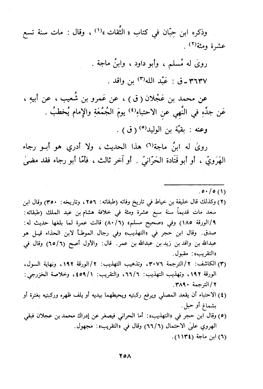 (5) وَقَال ابن حجر في "التهذيب": أما الحراني فيصغر عن إدراك محمد بن عجلان فبقي الهروي على الاحتمال (6 / 66) وَقَال في "التقريب": مجهول.