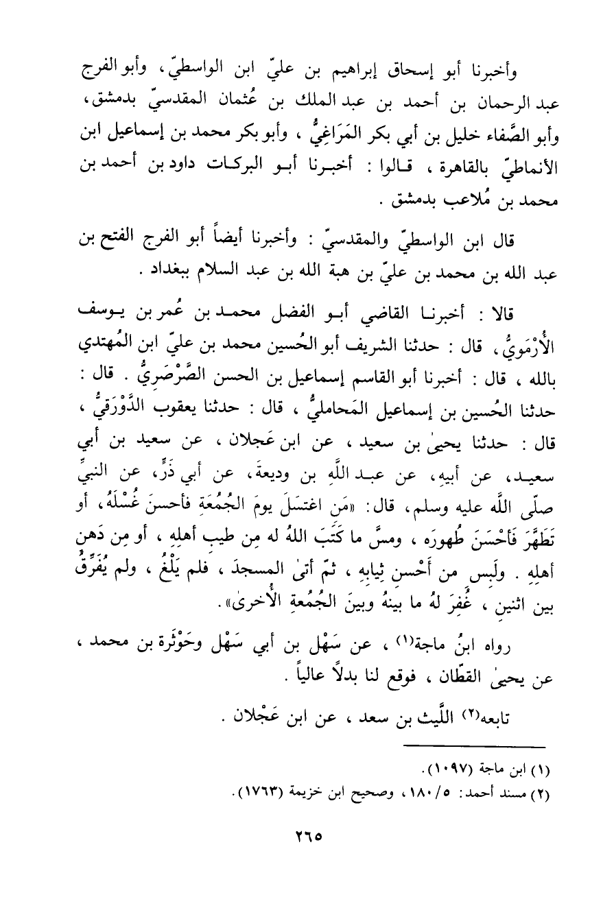 قَالا: أخبرنا الْقَاضِي أَبُو الْفَضْلِ مُحَمَّدُ بْنُ عُمَر بْنِ يُوسُفَ الأَرْمَوِيُّ، قال: حَدَّثَنَا الشريف أَبُو الْحُسَيْنِ مُحَمَّدُ بْنُ علي ابْنُ الْمُهَتِدِي بِاللَّهِ، قال: أَخْبَرَنَا أَبُو الْقَاسِمِ إِسْمَاعِيلُ بْنُ الْحَسَنِ الصَّرْصَرِيُّ، قال: حَدَّثَنَا الْحُسَيْنُ بْنُ إِسْمَاعِيلَ الْمَحَامِلِيُّ، قال: حَدَّثَنَا يَعْقُوبُ الدَّوْرَقِيُّ، قال: حَدَّثَنَا يَحْيَى بْنُ سَعِيد، عَنِ ابْنِ عَجْلانَ، عَنْ سَعِيد بْنُ أَبي سَعِيد، عَن أَبِيهِ، عَنْ عَبد اللَّهِ بْنِ ودِيعَةَ، عَن أَبِي ذَرٍّ، عَنِ النَّبِيُّ صلى الله عليه وسلم، قال: مَنِ اغْتَسَلَ يَوْمَ الْجُمُعَةِ فَأَحْسَنَ غُسْلَهُ، أَوْ تَطَهَّرَ فَأَحْسَنَ طَهُورَهُ، ومَسَّ مَا كَتَبَ اللَّهُ لَهُ مِنْ طِيبِ أَهْلِهِ، أَوْ مِنْ دُهْنِ أَهْلِهِ. ولَبِسَ مِنْ أَحْسَنِ ثِيَابِهِ، ثُمَّ أَتَى الْمَسْجِدَ، فَلَمْ يَلْغُ، ولَمْ يُفَرِّقْ بَيْنَ اثْنَيْنِ، غُفِرَ لَهُ مَا بَيْنَهُ وبَيْنَ الْجُمُعَةِ الأُخْرَى.