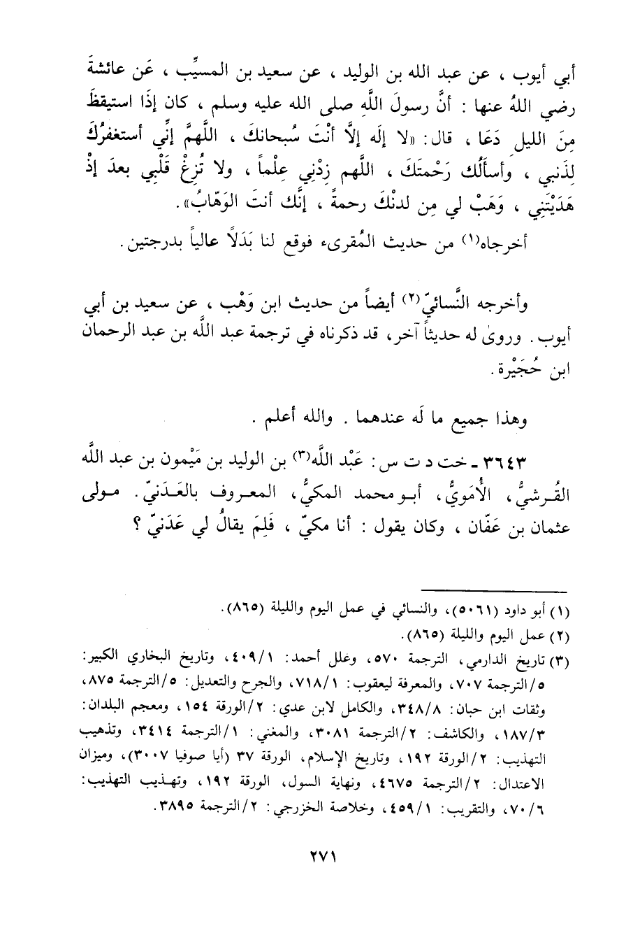 أَبِي أَيُّوبَ، عَنْ عَبد اللَّهِ بْنِ الْوَلِيدِ، عَنْ سَعِيد بْنِ المُسَيَّب، عَنْ عَائِشَةَ رَضِيَ اللَّهُ عَنْهَا: أَنَّ رَسُولَ اللَّهِ صلى اللَّهُ عَلَيْهِ وسَلَّمَ، كَانَ إِذَا اسْتَيْقَظَ مِنَ اللَّيْلِ دَعَا، قال: لا إِلَهَ إِلا أَنْتَ سُبْحَانَكَ، اللَّهُمَّ إِنِّي أَسْتَغْفِرُكَ لِذَنْبِي، وأَسْأَلُكَ رَحْمَتَكَ، اللَّهُمَّ زِدْنِي عِلْمًا، ولا تُزِغْ قَلْبِي بَعْدَ إِذْ هَدَيْتَنِي، وهَبْ لِي مِنْ لَدُنْكَ رَحْمَةً، إِنَّكَ أَنْتَ الْوَهَّابُ.