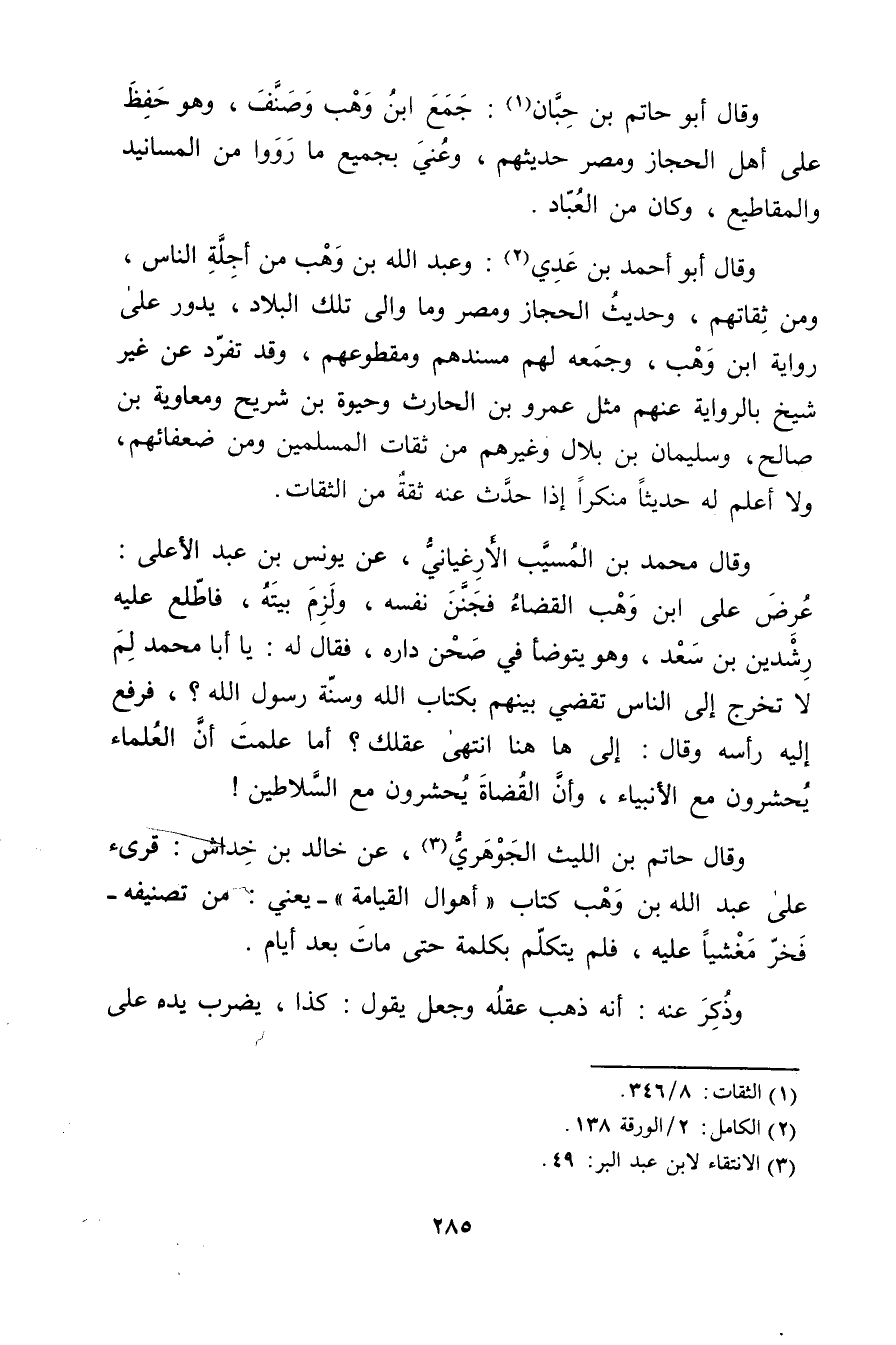 وَقَال أَبُو حَاتِم بْن حبان (1) : جمع ابْن وهب وصنف، وهُوَ حفظ عَلَى أهل الحجاز ومصر حديثهم، وعني بجميع ما رووا من المسانيد والمقاطيع، وكَانَ من العباد.