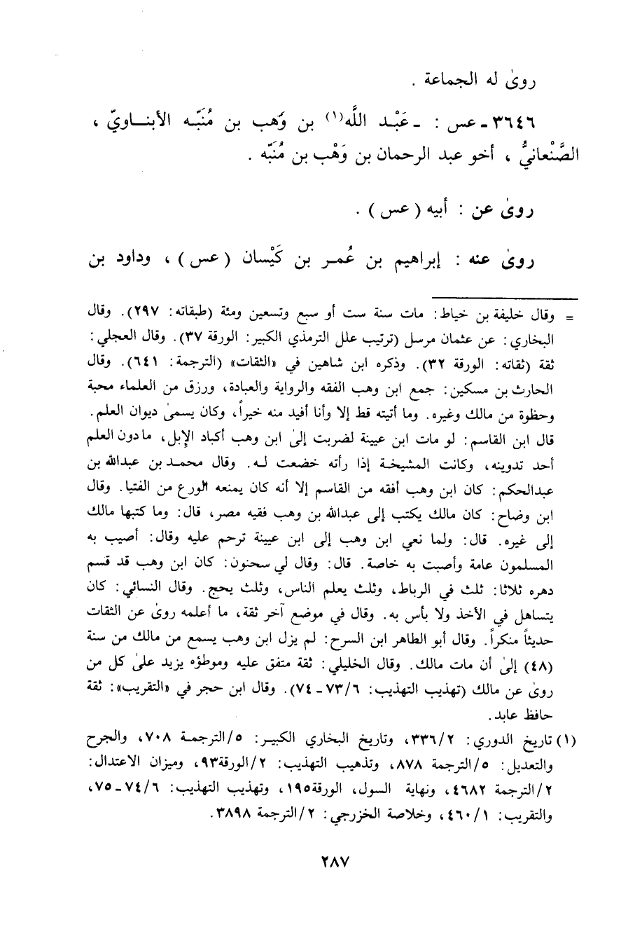 3646 - عس: - عَبد الله بْن وهب بْن منبه الا بناوي (1) ، الصنعاني، أخو عَبْد الرَّحْمَنِ بْن وهب بْن منبه.
