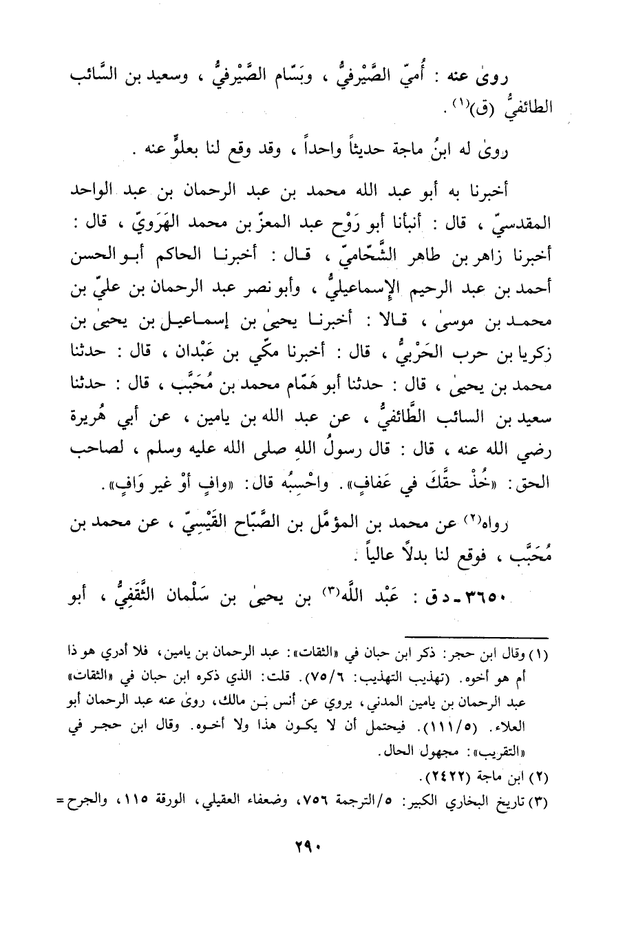 أَخْبَرَنَا بِهِ أَبُو عَبْد اللَّهِ مُحَمَّد بْن عَبْد الرَّحْمَنِ بْنِ عَبْدِ الْوَاحِدِ الْمَقْدِسِيُّ، قال: أنبانا أبو روح عبد المعز بْنُ مُحَمَّدٍ الْهَروي، قال: أَخْبَرَنَا زَاهِرُ بْنُ طَاهِرٍ الشَّحَّامِيُّ، قال: أَخْبَرَنَا الحاكم أَبُو الْحَسَن أَحْمَد بْنُ عَبد الرَّحِيمِ الإِسماعيلي، وأَبُو نَصْر عَبْد الرَّحْمَنِ بْن علي بْن مُحَمَّد بْن مُوسَى، قَالا: أخبرنا يَحْيَى بْنُ إِسْمَاعِيلَ بْنِ يَحْيَى بْن زكريا بْن حرب الحربي، قال: أَخْبَرَنَا مَكِّيّ بْن عَبْدَانَ، قال: حَدَّثَنَا مُحَمَّدُ بْنُ يَحْيَى، قال: حَدَّثَنَا أَبُو هَمَّامٍ مُحَمَّدِ بْنُ مُحَبَّبٍ، قال: حَدَّثَنَا سَعِيد بْنُ السَّائِبِ الطَّائِفِيُّ، عَنْ عَبد اللَّهِ بْنِ يَامِينَ، عَن أبي هُرَيْرة رضي الله عنه، قال: قال رسول الله صلى الله عليه وسلم، لِصَاحِبِ الْحَقِّ: خُذْ حَقَّكَ فِي عَفَافٍ". وأَحْسَبُهُ قال: وافٍ أَوْ غَيْرُ وافٍ.