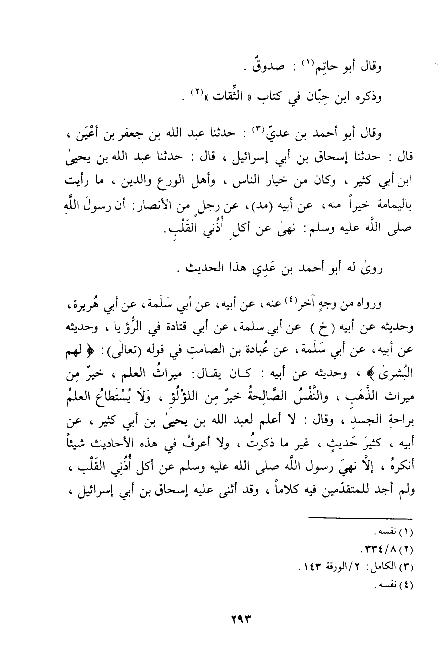 ورَوَاهُ مِنْ وجْهٍ آخَرَ (4) عَنْهُ، عَن أَبِيهِ، عَن أَبِي سَلَمَةَ، عَن أَبِي هُرَيْرة، وحديثه عَن أبيه (خ) عَن أبي سلمة، عَن أبي قتادة فِي الرؤيا، وحديثه عَن أبيه، عَن أبي سلمة، عَنْ عبادة بْن الصامت فِي قوله (تعالى) : [لهم البشرى] ، وحديثه عَن أبيه: كَانَ يقال: ميراث العلم، خير من ميراث الذهب، والنفس الصالحة خير من اللؤلؤ، ولا يستطاع العلم براحة الجسد، وَقَال: لا أعلم لعَبْد اللَّهِ بْن يَحْيَى بْن أَبي كثير، عَن أبيه، كثير حديث، غير ما ذكرت، ولا أعرف فِي هَذِهِ الأحاديث شيئا أنكره، إلا نهي رَسُول اللَّهِ صَلَّى اللَّهُ عَلَيْهِ وسَلَّمَ عَن أكل أذني القلب، ولم أجد للمتقدمين فِيهِ كلاما، وقد أثني عليه إِسْحَاق بْن أَبي إسرائيل،