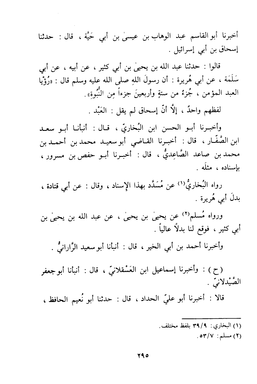 قَالُوا: حَدَّثَنَا عَبد اللَّهِ بْن يَحْيَى بْن أَبي كثير، عَن أَبِيهِ، عَن أَبِي سَلَمَةَ، عَن أَبِي هُرَيْرة: أَنَّ رَسُولَ اللَّهِ صلى الله عليه وسلم قال: رُؤْيَا الْعَبْدِ الْمُؤْمِنِ، جُزْءٌ مِنْ سِتَّةٍ وأَرْبَعِينَ جُزْءًا مِنَ النُّبُوَّةِ.