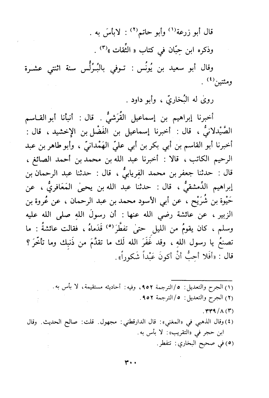 أخبرنا إِبْرَاهِيمُ بْنُ إِسْمَاعِيلَ الْقُرَشِيُّ. قال: أَنْبَأَنَا أَبُو الْقَاسِمِ الصَّيْدَلانِيُّ، قال: أخبرنا إِسْمَاعِيلُ بْنُ الْفَضْلِ بْنِ الإِخْشِيدِ، قال: أخبرنا أَبُو القاسم بْن أَبي بَكْرِ بْن أَبي عَلِيٍّ الْهَمْدَانِيُّ، وأَبُو طَاهِرِ بْنِ عَبْدِ الرَّحِيمِ الْكَاتِبُ، قَالا: أخبرنا عَبد اللَّهِ بْن مُحَمَّد بْنِ أَحْمَدَ الصَّائِغُ، قال: حَدَّثَنَا جعفر بْن مُحَمَّد الفريابي، قال: حَدَّثَنَا عَبْدُ الرَّحْمَنِ بْنُ إِبْرَاهِيمَ الدِّمَشْقِيُّ، قال: حَدَّثَنَا عَبد اللَّهِ بْنُ يَحْيَى الْمَعَافِرِيُّ، عَنْ حَيْوَةَ بْن شُرَيْحٍ، عَن أَبِي الأَسْوَدِ مُحَمَّدِ بْنِ عَبْدِ الرَّحْمَنِ، عَنْ عُرْوَةَ بْنِ الزُّبَيْرِ، عَنْ عَائِشَةَ رضي الله عَنْهَا: أَنَّ رَسُولَ اللَّهِ صلى اللَّهُ عَلَيْهِ وسَلَّمَ، كَانَ يَقُومُ مِنَ اللَّيْلِ حَتَّى تَفَطَّرَ (5) قَدَمَاهُ، فَقَالَتْ عَائِشَةُ: مَا تَصْنَعُ يَا رَسُولَ اللَّهِ، وقَدْ غَفَرَ اللَّهُ لَكَ مَا تَقَدَّمَ مِنْ ذَنْبِكَ ومَا تَأَخَّرَ؟ قال: أَفَلا أُحِبُّ أن أكون عبدا شكورا.