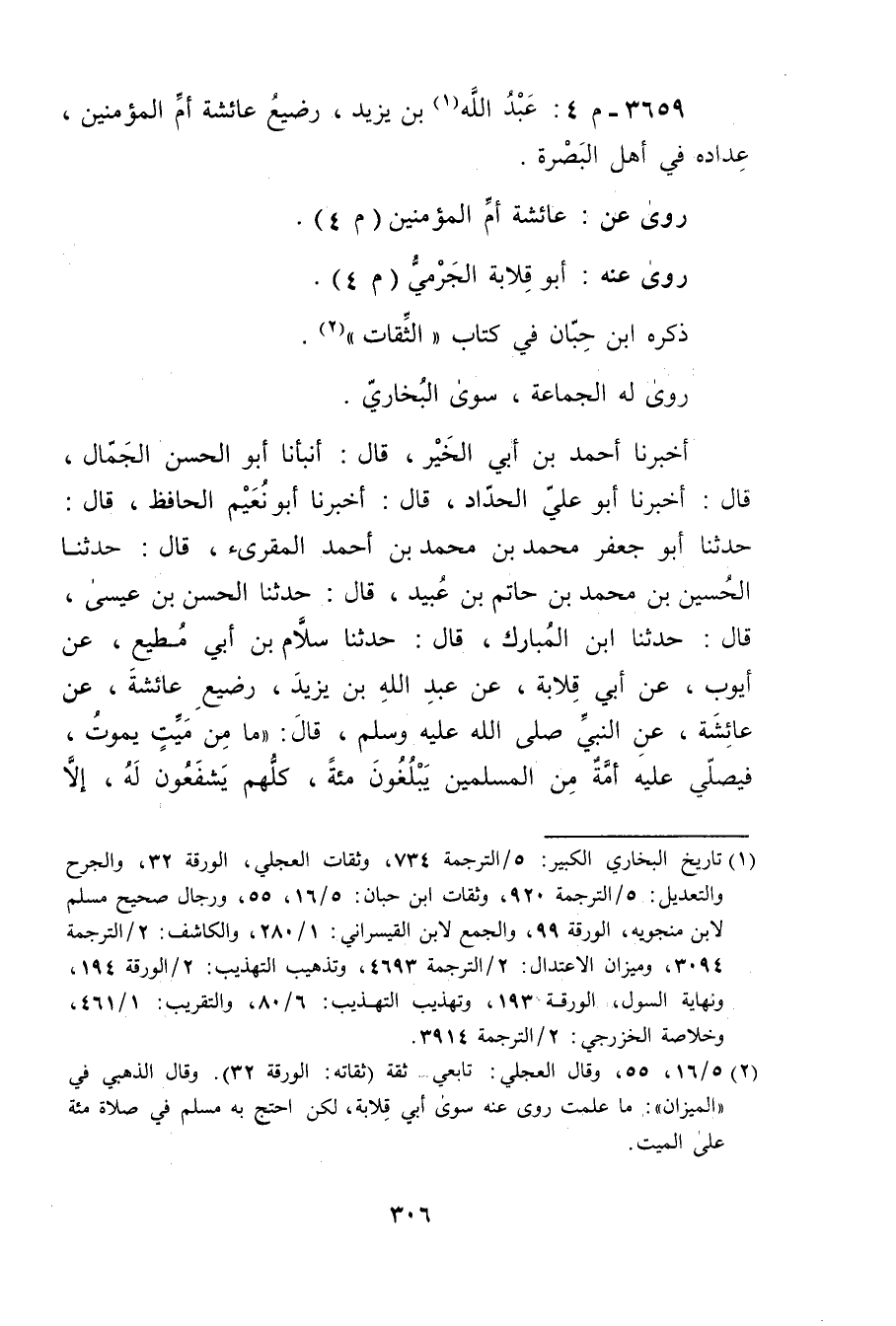 أخبرنا أَحْمَدُ بْنُ أَبي الخير، قال: أَنْبَأَنَا أَبُو الْحَسَنِ الجمال، قال: أَخْبَرَنَا أَبُو عَلِيّ الحداد، قال: أَخْبَرَنَا أَبُو نُعَيْمٍ الْحَافِظُ، قال: حَدَّثَنَا أَبُو جعفر مُحَمَّد بْن مُحَمَّدِ بْن أَحْمَد المقرئ، قال: حَدَّثَنَا الحسين بْن مُحَمَّد بْن حَاتِم بْن عُبَيد، قال: حَدَّثَنَا الْحَسَنُ بْنُ عِيسَى، قال: حَدَّثَنَا ابْنُ الْمُبَارَكِ، قال: حَدَّثَنَا سَلامُ بْنُ أَبي مُطَيْعٍ، عَنْ أَيُّوبَ، عَن أَبِي قِلابَةَ، عَنْ عَبد اللَّهِ بْنِ يَزِيدَ، رَضِيعِ عَائِشَةَ، عَنْ عَائِشَةَ، عَنِ النَّبِيِّ صلى الله عليه وسلم، قال: مَا مِنْ مَيِّتٍ يَمُوتُ، فَيُصَلِّي عَلَيْهِ أُمَّةٌ مِنَ المسلمين يبلغون مئة، كلهم يشفعون له، إلا