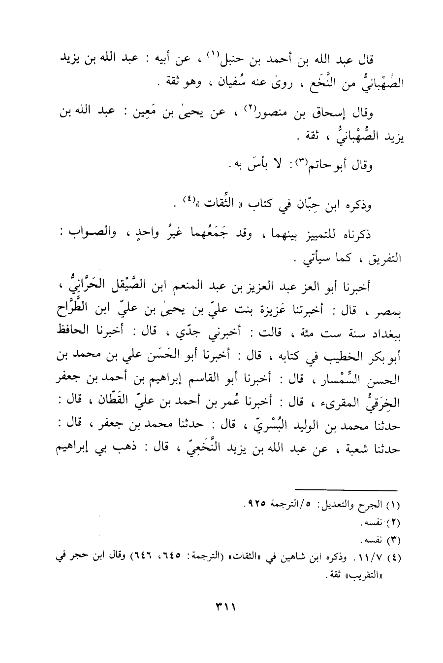 قال عَبد اللَّهِ بْن أَحْمَد بْن حَنْبَلٍ (1) ، عَن أبيه: عَبد اللَّهِ بْن يَزِيدَ الصهباني من النخع، روى عنه سفيان، وهُوَ ثقة.