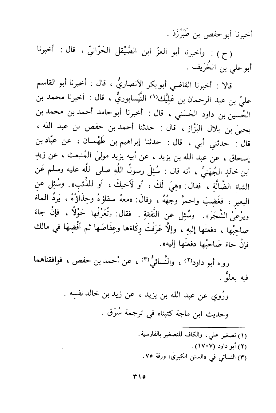 قَالا: أَخْبَرَنَا الْقَاضِي أَبُو بكر الأَنْصارِيّ، قال: أَخْبَرَنَا أَبُو الْقَاسِمِ عَلِيُّ بْنُ عَبْدِ الرَّحْمَنِ بْنِ عَلِيَّكَ (1) النَّيْسَابُورِيُّ، قال: أَخْبَرَنَا مُحَمَّد بْن الْحُسَيْن بْنِ دَاوُدَ الْحَسَنِيُّ، قال: أخبرنا أَبُو حامد أَحْمَد بْن مُحَمَّد بْن يحيى بْن بلال البزاز، قال: حَدَّثَنَا أَحْمَدُ بْنُ حَفْصِ بْن عَبد اللَّهِ، قال: حَدَّثني أَبِي، قال: حَدَّثَنَا إِبْرَاهِيمُ بْنُ طهمان، عن عباد بن إسحاق، عن عَبد الله بْن يزيد، عَن أَبِيهِ يَزِيدَ مَوْلَى الْمُنْبَعثِ، عن زيد ابن خَالِدٍ الْجُهَنِيِّ، أَنَّهُ قال: سُئِلَ رَسُول اللَّهِ صلى الله عليه وسلم عَنِ الشَّاةِ الضَّالَّةِ، فَقَالَ: هي لك، أولاخيك، أَوْ لِلذِّئْبِ". وسُئِلَ عَنِ الْبَعِيرِ، فَغَضِبَ واحْمَرَّ وجْهُهُ، وَقَال: مَعَهُ سِقَاؤُهُ وحِذَاؤُهُ، يَرِدُ الْمَاءَ ويَرْعَى الشَّجَرَ". وسُئِلَ عَنِ النَّفَقَةِ. فَقَالَ: تُعَرِّفُهَا حَوْلا، فَإِنْ جَاءَ صَاحِبُهَا، دَفَعْتَهَا إِلَيْهِ، وإِلا عَرَّفْتَ وكَاءَهَا وعِفَاصَهَا ثُمَّ أَفْضِهَا فِي مَالِكَ فَإِنْ جَاءَ صَاحِبُهَا دَفَعْتَهَا إِلَيْهِ.