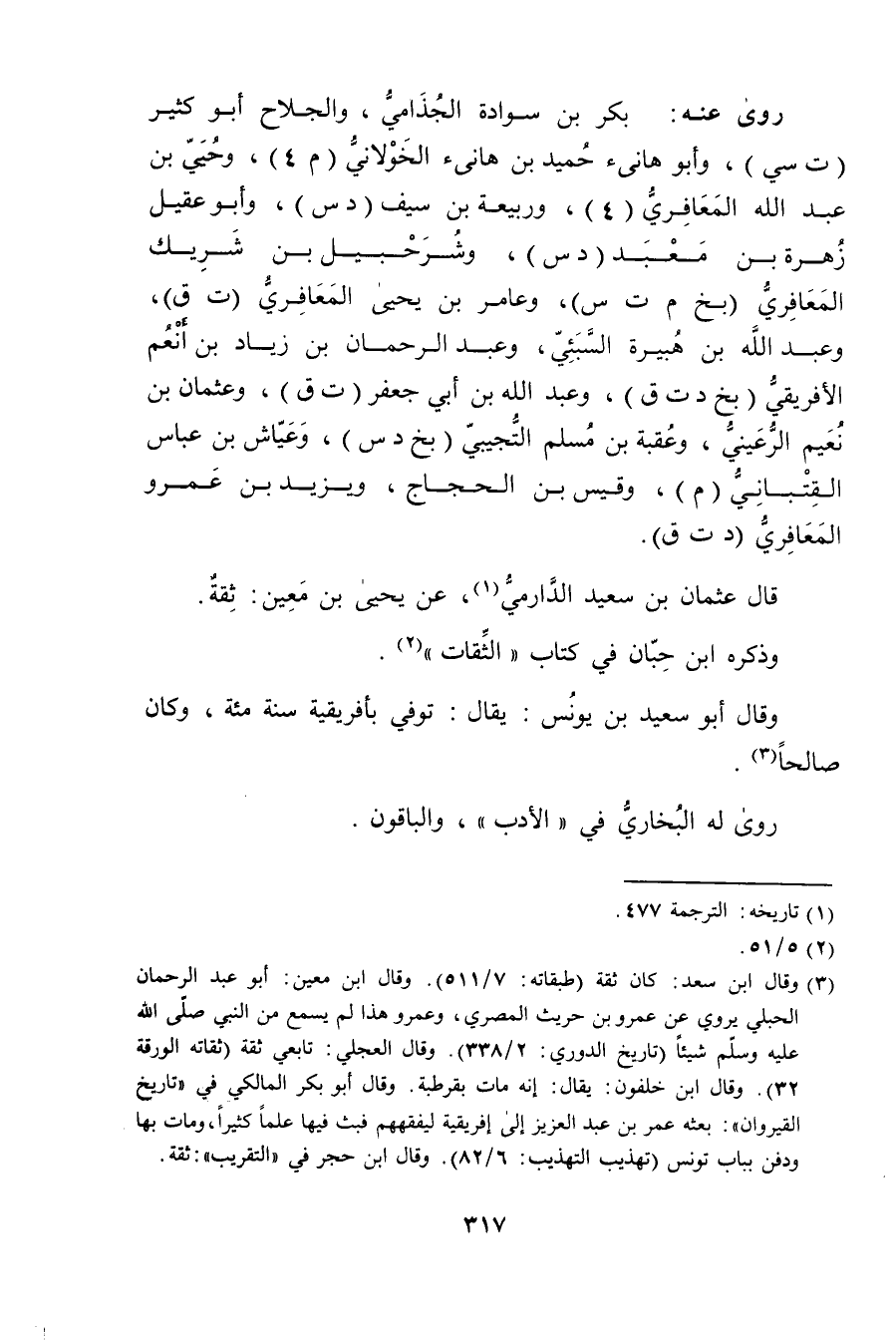 (3) وَقَال ابن سعد: كان ثقة (طبقاته: 7 / 511) . وَقَال ابن مَعِين: أبو عبد الرحمن الحبلي يروي عن عَمْرو بن حريث المِصْرِي، وعَمْرو هذا لم يسمع من النبي صَلَّى الله عليه وسلم شيئا (تاريخ الدوري: 2 / 338) . وَقَال العجلي: تابعي ثقة (ثقاته الورقة 32) . وَقَال ابن خلفون: يقال: إنه مات بقرطبة. وَقَال أبو بكر المالكي في "تاريخ القيروان": بعثه عُمَر بن عبد العزيز إلى إفريقية ليفقههم فبث فيها علما كثيرا، ومات بها ودفن بباب تونس (تهذيب التهذيب: 6 / 82) . وَقَال ابن حجر في "التقريب": ثقة.