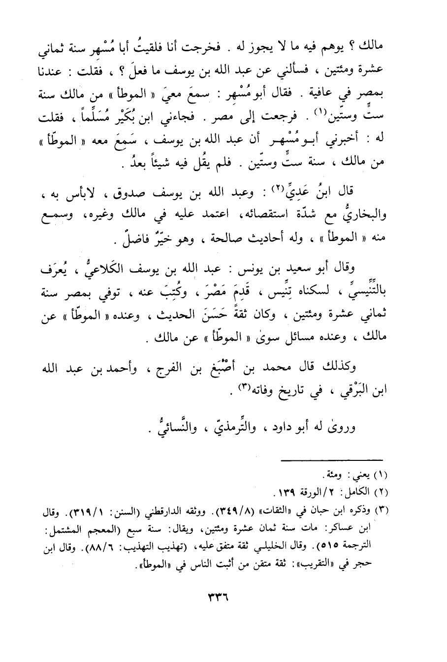(3) وذكره ابنُ حِبَّان في "الثقات" (8 / 349) . ووثقه الدارقطني (السنن: 1 / 319) . وَقَال ابن عساكر: مات سنة ثمان عشرة ومئتين، ويُقال: سنة سبع (المعجم المشتمل: الترجمة 515) . وَقَال الخليلي ثقة متفق عليه، (تهذيب التهذيب: 6 / 88) وَقَال ابن حجر في "التقريب": ثقة متقن من أثبت الناس في "الموطأ".