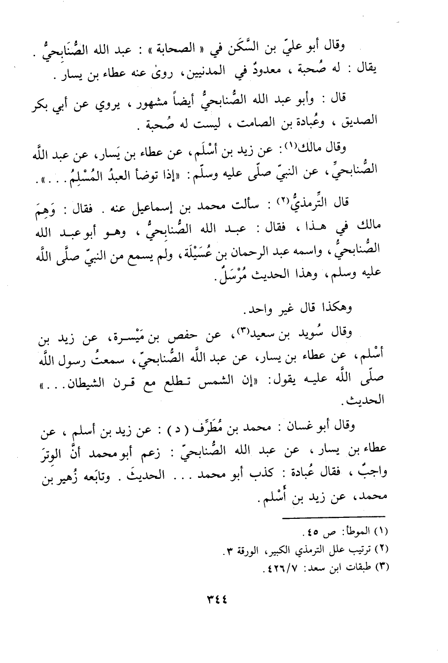 قال التِّرْمِذِيّ (2) : سألت مُحَمَّد بْن إِسْمَاعِيلَ عنه. فَقَالَ: وهم مالك فِي هَذَا، فَقَالَ: عَبد اللَّهِ الصُّنَابِحِيّ، وهُوَ أَبُو عَبْدِ اللَّهِ الصُّنَابِحِيّ، واسمه عَبْد الرَّحْمَنِ بْن عسيلة، ولم يسمع من النَّبِيُّ صلى الله عليه وسلم، وهذا الْحَدِيث مرسل.