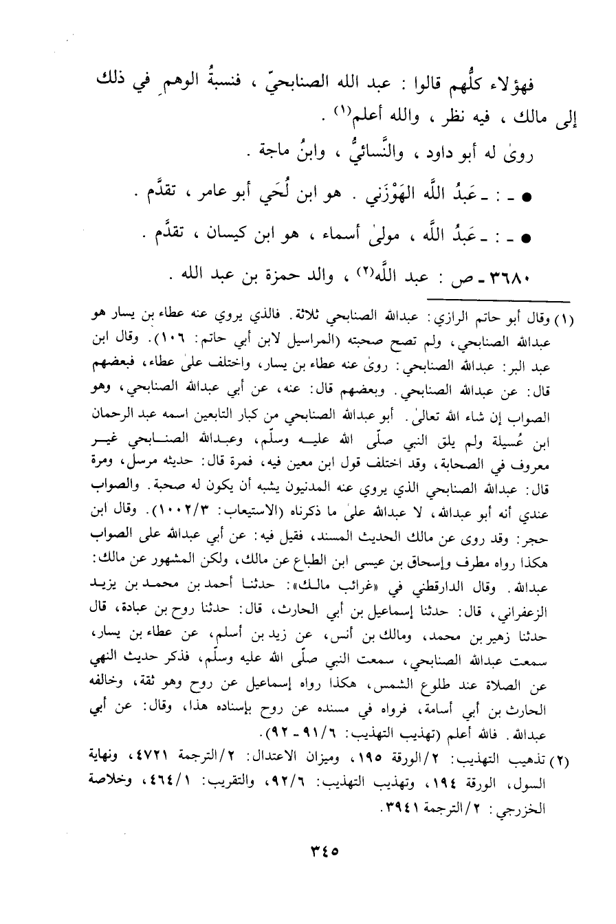 (1) وَقَال أَبُو حاتم الرازي: عَبد الله الصنابحي ثلاثة. فالذي يروي عنه عطاء بن يسار هو عَبد الله الصنابحي، ولم تصح صحبته (المراسيل لابن أَبي حاتم: 106) . وَقَال ابن عَبد الْبَرِّ: عَبد اللَّهِ الصُّنَابِحِيّ: روى عنه عطاء بن يسار، واختلف على عطاء، فبعضهم قال: عَنْ عَبد اللَّه الصنابحي.