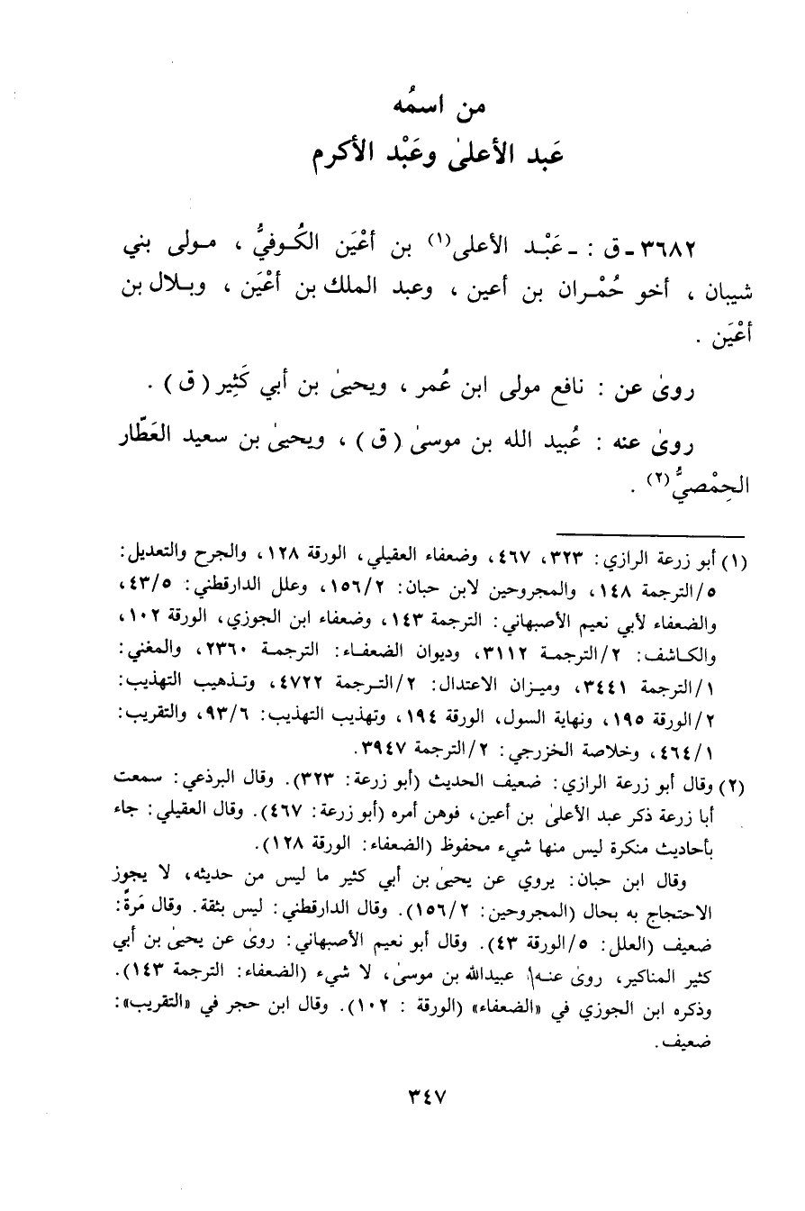 3682 - ق: - عبد الاعلى بن أعين الكوفي (1) ، مولى بني شيبان، أخو حمران بْن أعين، وعبد الملك بْن أعين، وبلال بْن أعين.