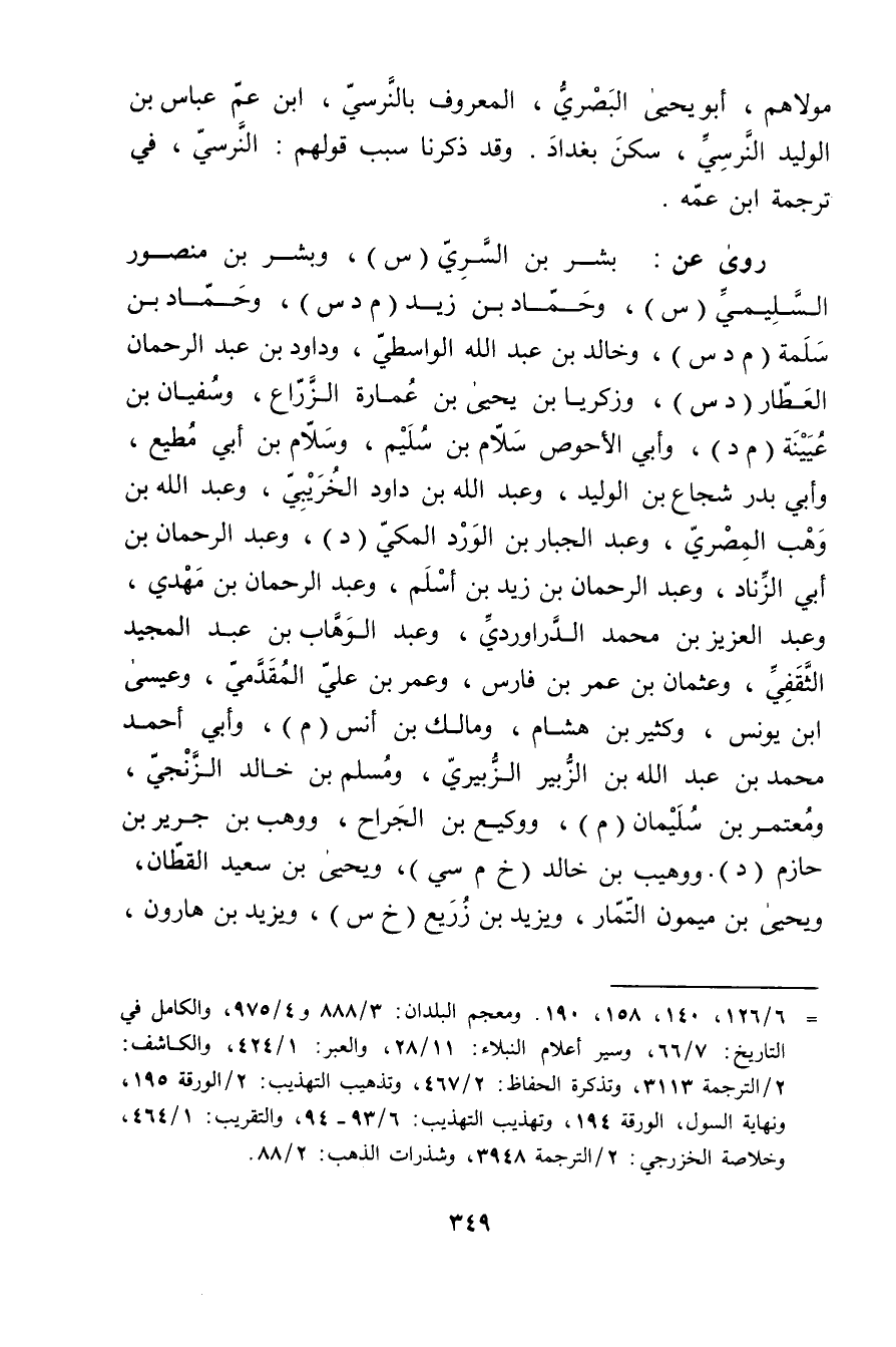 = 6 / 126، 140، 158، 190. ومعجم البلدان: 3 / 888 و4 / 975، والكامل في التاريخ: 7 / 66، وسير أعلام النبلاء: 11 / 28، والعبر: 1 / 424، والكاشف: 2 / الترجمة 3113، وتذكرة الحفاظ: 2 / 467، وتذهيب التهذيب: 2 / الورقة 195، ونهاية السول، الورقة 194، وتهذيب التهذيب: 6 / 93 - 94، والتقريب: 1 / 464، وخلاصة الخزرجي: 2 / الترجمة 3948، وشذرات الذهب: 2 / 88.