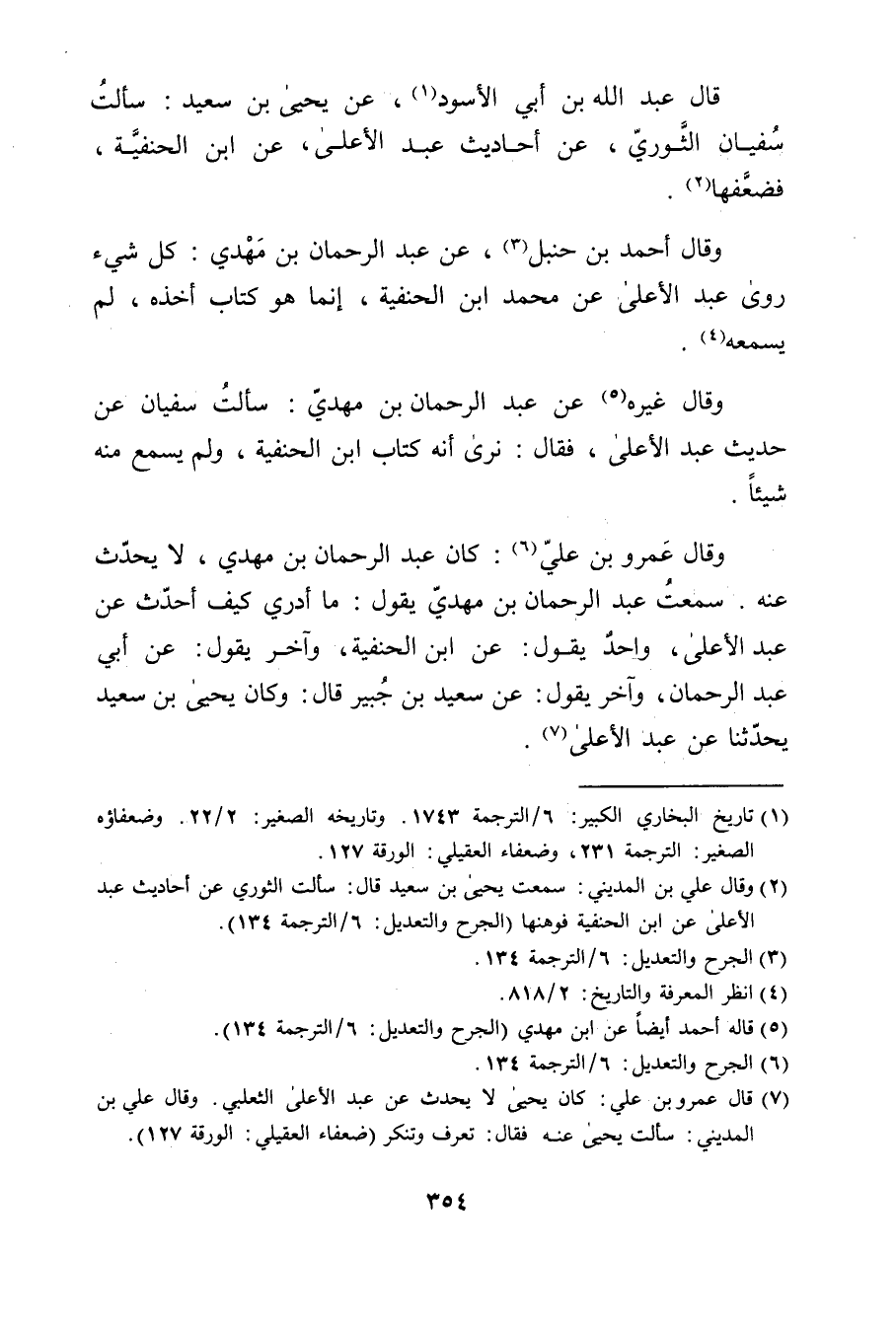 (2) وَقَال علي بن المديني: سمعت يحيى بن سَعِيد قال: سألت الثوري عَنْ أحاديث عبد الأعلى عن ابن الحنيفة فوهنها (الجرح والتعديل: 6 / الترجمة 134) .