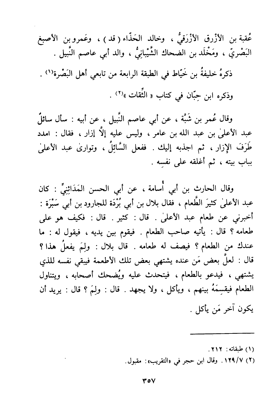 وَقَال الحارث بْن أَبي أسامة، عَن أبي الحسن المدائني: كان عبد الاعلى كثير الطعام، فَقَالَ بلال بْن أَبي بردة للجارود بْن أَبي سبرة: أخبرني عن طعام عبد الاعلى. قال: كثير. قال: فكيف هُوَ علي طعامه؟ قال: يأتيه صاحب الطعام. فيقوم بين يديه، فيقول لَهُ: ما عندك من الطعام؟ فيصف لَهُ طعامه. قال بلال: ولم يفعل هَذَا؟ قال: لعل بعض من عنده يشتهي بعض تلك الأطعمه فيبقي نفسه للذي يشتهي، فيدعو بالطعام، فيتحدث عليه ويضحك أصحابه، ويتناول الطعام فيقسمه بينهم، ويأكل، ولا يجهد. قال: ولم؟ قال: يريد أن يكون آخر من يأكل.